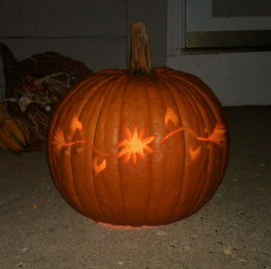 Oh, and I can’t forget to post our jack o’ lanterns, either. Tom and I decided to go very different routes when carving this year. I’ll let you guess who did what!