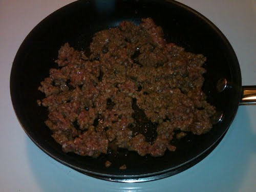 Step 1: Brown some ground beef in a pan on the stove. Season with salt, pepper, and garlic – NOT “taco seasoning”! Don’t get me wrong, I like taco seasoning. Just not in tacos.