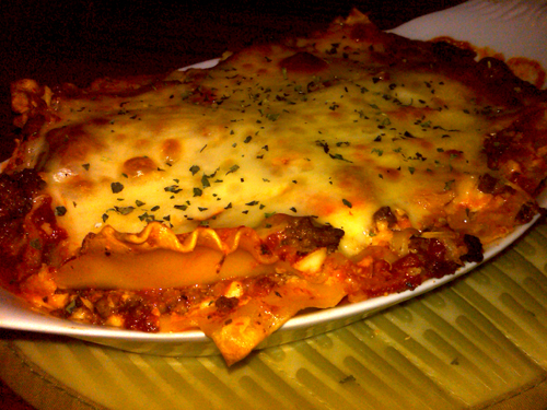 Lasagna was one of the first meals my mom taught me how to cook. It’s not terribly difficult, but does take some time to put together. My husband, Tom, likes lasagna a lot more than I do, so I usually end up making it at his prompting. Part of the problem is that it makes SO much lasagna that I have leftovers for a week! I’m sure it’d be great for a family, but since it’s just the two of us, I usually get sick of lasagna before we can get through it all. Often times I wait until we have company coming over to help us eat it. This week, though, I decided to try something new: individual lasagna pans. You know, like they do at restaurants. I forgot to put foil over it while baking, so the edges got a little crispy, but Tom didn’t seem to mind!