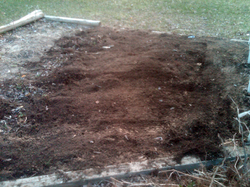 The only perennial plants that I have in my vegetable garden right now are my strawberries. I’m still wondering if perhaps those belong somewhere else? At any rate, I took the area between the strawberries and the deck and cleaned it up a little. I tilled up the dirt and added a few bags of composted manure and raked it out.