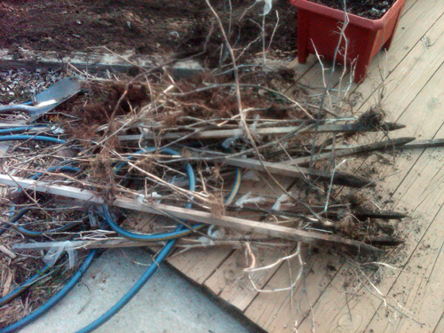 Due to my “spring break” vacation at the beginning of the month, I had to delay the start of my garden by a couple weeks. It’s probably not a bad thing, seeing as though we’ve had a very cold spring thus far. However, today I was finally able to officially start my vegetable garden! I had started some seeds indoors a while back, but had not been able to get out to my garden plot and dig in the dirt. I’m really not sure what the proper care of a garden plot entails, but whatever I was supposed to do last fall, I didn’t do. That means that today I had to go and pull up all my old plants, roots and garden stakes from last year.