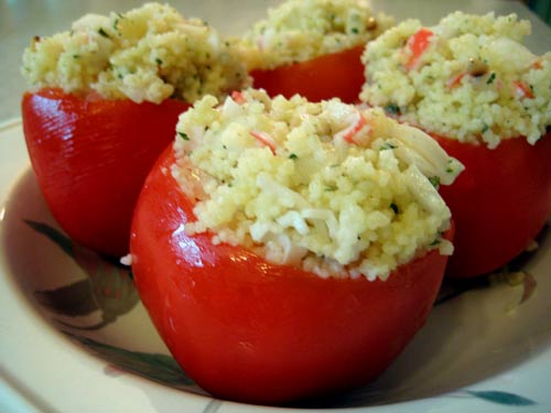 Overall, I liked this recipe. It was different from a lot of the things I normally make and not too difficult to prepare. What was difficult, however, was eating them! I cut the tomatoes with a fork and knife and would take a bite like that. Tom, on the other hand, cut his tomatoes in half, picked up a half and just started chomping! They are a little bit messy to eat, but the taste was good. I also had a lot of the filling leftover, which I just ate by itself…so, really, you could stuff more than 4 tomatoes! For convenience sake, I think next time I might just add diced tomatoes to the couscous mixture. However, the presentation won’t be quite as unique!