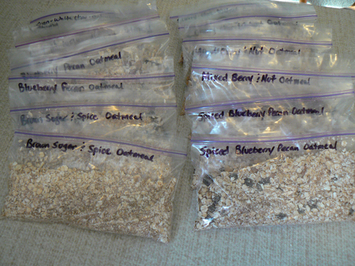 For these blends, I basically just tossed a handful or so of each of the ingredients into 1 cup of the base mix. I then divvied each mix up into two baggies, one for me and one for Tom.