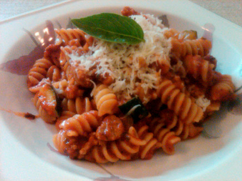 It’s that time of year again: zucchini season. Last year was my first attempt to garden and grow vegetables, and zucchini was one of the veggies I chose. The plants did not grow as well as I’d hoped, and while I did get a fair amount of zucchini, it wasn’t the overabundance that I actually kind of hoped for. This year, I planted more and they are starting to grow! I picked four zucchinis so far this week and have another three or four on the vine. I have a feeling that I may get more overloaded this year than last. The trick then becomes: what to do with all that squash! I will be looking up some fun and creative recipes and freezing some for later in the year, but I used my first zucchini of the season tonight in a pasta dish. I think I had made something like this before…and I had some leftover cooked ground turkey meat from last night’s dinner (turkey tacos), so I decided to try it again. Here’s what I did:Ingredients: