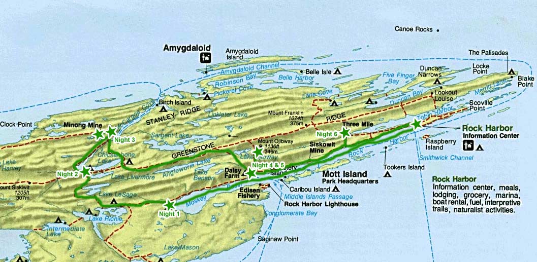 5. In 96, we started at Rock Harbor and went down to 3-Mile, Daisy Farm and Moskey Basin, then back to Rock Harbor. We stayed a couple nights at each of those places and took a lot of day-hikes with day-packs. In 2001, we started at Rock Harbor, humped the canoe over the ridge to Duncan Bay, and paddled to Lane Cove, Belle Isle, Pickerel Cove, then McCargo Cove. Stayed a couple nights there, then got a water taxi back to Rock Harbor. In 2012, started from Rock Harbor, paddled down to Daisy Farm. We wanted to get to Moskey Basin, but the wind was howling from the SouthWest and made the paddle quite brutal. We portaged that 2.3 mile deal from Moskey to Lake Ritchie which was pretty exhausting. It can be done, just plan on being really tired and sore afterwards. Lucky for us, most of the portages were very short on our route. lol. After that, we portaged/paddled our way through Lakes LeSage, Livermore, Chickenbone, etc and ended up at McCargo for the evening. Took a day-hike to Minong mine, then the same day paddled up to Birch Isle for a night. Next morning, it looked like Lake Superior was calm and there was no wind, so we headed out on that treacherous 1.5 mile paddle that's exposed to the open lake. We got out there, and the wind/waves picked up and we were dealing with 5-foot swells. Not good. We kept our heads though, and as soon as we turned towards Pickerel Cove and we were running with the wind/waves, god what a relief. I would not recommend doing that….. they really need some sort of portage from Birch Isle to Pickerel…..somehow. Portaged across into Pickerel, then over to Belle Isle, then Duncan Bay, then back to Rock Harbor. I think next time we'll backpack from Rock Harbor to Windigo…