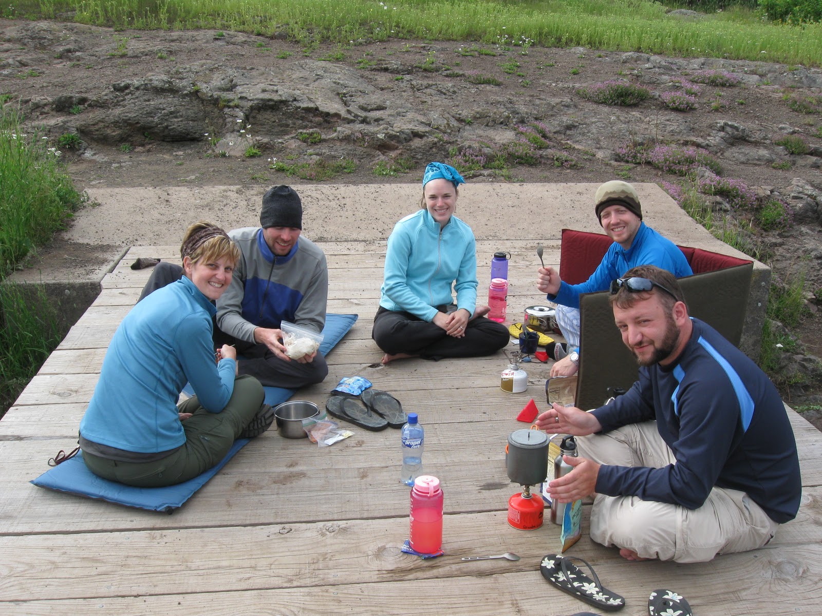 We were very fortunate to have beautiful weather the whole trip, though.  We had one evening where it sprinkled, but did not rain hard.  Fortunately, if it was cold or rainy at night, we had the shelters that we could all hang out in and still have some fun.  There was only one hiking day where it threatened to rain, and we got all suited up, fully expecting to get wet.  It remained overcast, but the rain held off for us.  The last day of the trip, we awoke to an extremely foggy morning–to the point that we couldn’t really make out the water.  It began to clear, however, as we hiked and we ended up with some beautifully sunny skies as we finished out our trek.  But before our ferry left, the eerie fog had settled in once more.  I suppose we just weren’t meant to see the island from the boat.