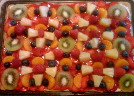 Fruit pizza is a dessert that has been a tradition in my family for a long time. The original recipe came from our family cook book, but my mom and I have re-vamped it a little so that it’s more to our liking. It’s a delicious dessert that’s great for summertime, when there are lots of fresh berries available. In fact, I made a fruit pizza for Tom’s birthday this year. I was going to make him ice cream cake (perhaps a future recipe to come), but then suddenly thought: hey, it’s berry season—I should make a fruit pizza! And, Tom was in agreement, so I did. However, summer is not the only time my family enjoys this dessert…oh, no…it is often most coveted during the winter months.
