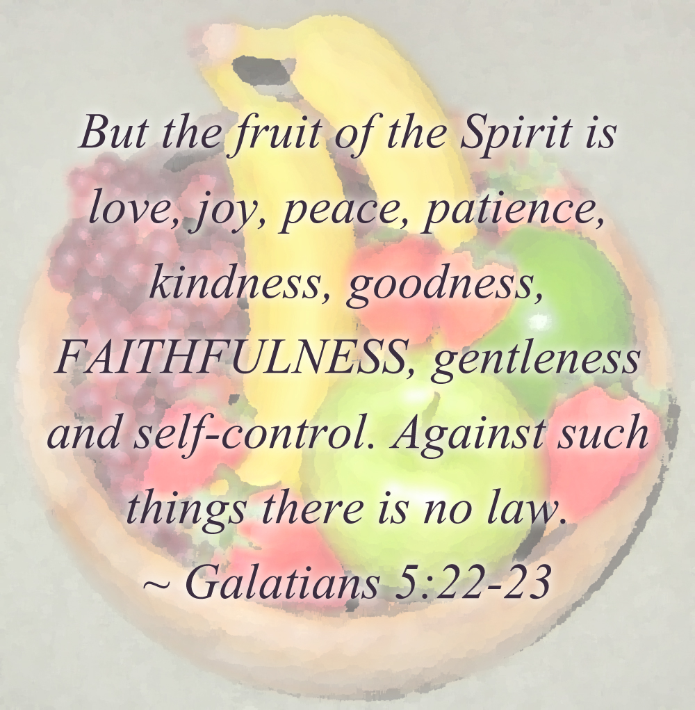 Next up in my Fruit of the Spirit study is faithfulness. The word “faithfulness” that is used here is translated from the Greek word, pistis, which means “trust-worthiness” according to Vine’s Dictionary. In Matthew Henry’s Bible Commentary, he defines faith[fulness] here as “fidelity, justice, and honesty, in what we profess and promise to others.” We must remain true to the faith if we are to live a Spirit-filled life. I believe that means practicing what you preach and living a life that is generally consistent with the way of life Jesus teaches. We must keep our hope and trust in Jesus consistently. In personal interactions it means being true to others, following through with our word and acting with integrity. God has entrusted us with the great responsibility of acting as his ambassadors to the rest of the world by glorifying him with the way we live our lives. We are faithful if we carry out the responsibilities entrusted to us by God.