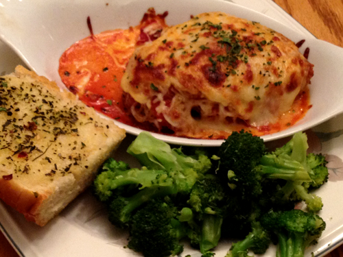 Preheat oven to 350 degrees. Pound out chicken to flatten (for the two of us, I actually just cut one big chicken breast in half, then flattened). Place breadcrumbs in a bowl and add seasoning to taste (normally I put in some garlic and sometimes some shredded Parmesan cheese, too). Put a little bit of milk in another bowl. Dip chicken in milk, then coat with bread crumbs. Repeat. Heat a couple Tbsp. of oil in a skillet over medium heat and add chicken. Cook for 5 minutes, then flip chicken over. Cook for another 5 minutes or until chicken is just fully cooked. Transfer chicken to a baking dish and spoon enough spaghetti sauce over the top to cover. Cover with cheese. Bake until cheese is melted, then broil for a couple of minutes until cheese begins to brown. Voila!