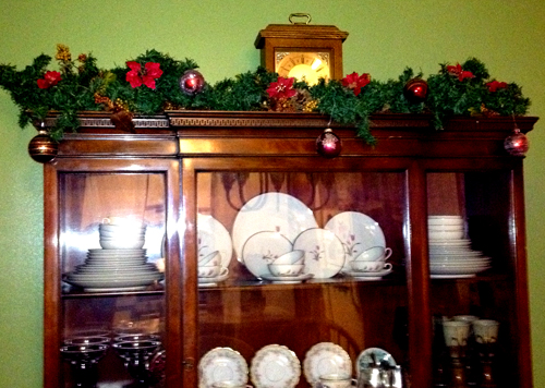 I ended up really liking the way the garland looked with the ornaments hanging from it, so I decided to do the same thing on the top of our china cabinet in the dining room: