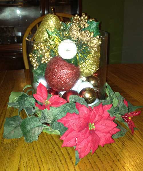 I put some mini ornaments and a few decorative items in a large glass vase for the center piece on our kitchen table: