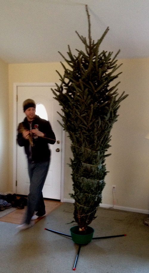 I was all ready just go get a pre-cut Charlie Brown style tree and call it good, to just get a tree up and be done with it, but I’m glad he talked me into getting a nice one! Only…it looked a lot smaller outside…once we got it in, we had to cut a bit off the top! The tree was over 9 feet tall. I wanted to put it in the middle of the room where our ceiling is highest, because it would have fit. But, alas, the base of the tree was much larger than what would fit there (that’s where the Charlie Brown tree would have gone!) So, we did some re-arranging, and Tom placed the tree right by the front door in our living room.