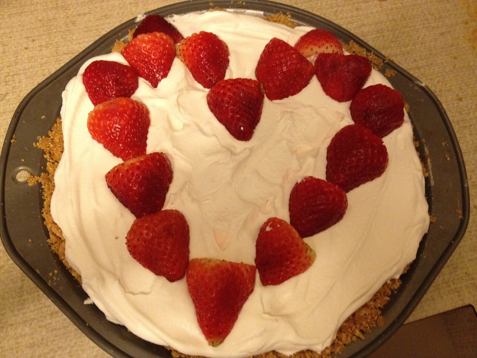 Spread whipped cream over ice cream layer, then top with halved strawberries. I decided to do mine in a heart shape for the occasion!