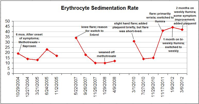 After a month of bi-weekly Humira, I switched to weekly doses, and have now been at that for two months…giving me a total of three months on Humira. My symptoms seem to be improving, as I’ve been more stable the last few weeks, and am definitely gaining range of motion and strength in my wrists. Given this improvement, I was guessing (hoping) that my ESR would have fallen down to near 30. Wrong. I had my blood work done yesterday, shortly after my rheumatology appointment, and got the results back today: 42. Ugh. That’s hardly progress, though I guess we’ll count it anyways.