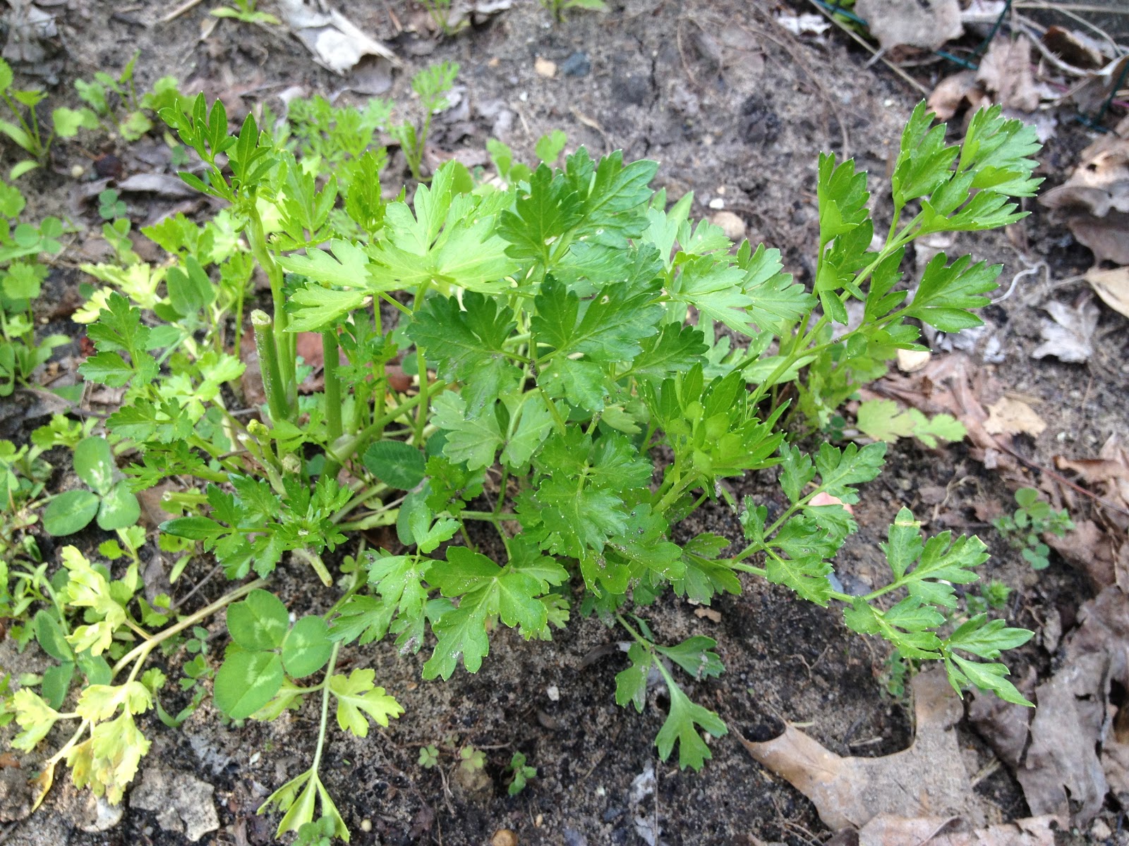 And, finally, there’s this plant. This is my invincible parsley plant. I started growing it 3 years ago, before we moved into our house. I grew it in a pot on our deck, and it thrived. After we got our house, I kept it indoors in our sun room and it continued to grow, despite the little attention it received. The next spring, I decided to plant it in my garden since it was still hanging on. I thought that parsley was supposed to be an annual, but I just looked it up and saw that it’s a biennial. That might make more sense, but even on the “off” years, this plant has gone crazy. Every time I think I’ve killed it, it just comes back. It’s suffered a lot of neglect, but I think I’m going to start actually nurturing it. Apparently parsley is a great companion plant and will help attract predatory insects to eat and kill the insects that eat my vegetables (thank you, Wikipedia!).