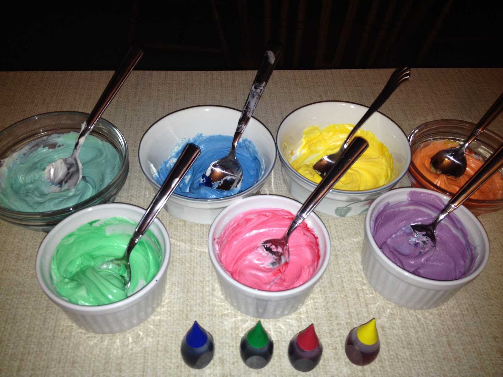 Anyways, I took a hint from the how-to guide and decided to bake the brownies in a 9×13 pan rather than the 8×8 that the recipe calls for. The thinner brownies make for easier cutting. While the brownies were cooking/cooling, I colored the frosting. I ended up just using a can of vanilla frosting from the store. I put a scoop of it into seven different bowls for the seven colors I would need. I had to decide which version of Tetris I would base my tetriminos (Tetris pieces) off of, since the colors vary. I ended up going with the “Tetris Company”/”Tetris Party” colors (thank you for the easy display of options, Wikipedia), and I’m glad I did because I think it was the easiest color scheme to make. I bought a multi-pack of food coloring that came with red, blue, yellow, and green (apparently people have a hard time making green??). Most of the colors were pretty straightforward. The only one that was a bit tricky was cyan. I didn’t want it to end up just a lighter version of blue, so I did a few drops of blue and one drop of green to give it a little more of that aqua look.