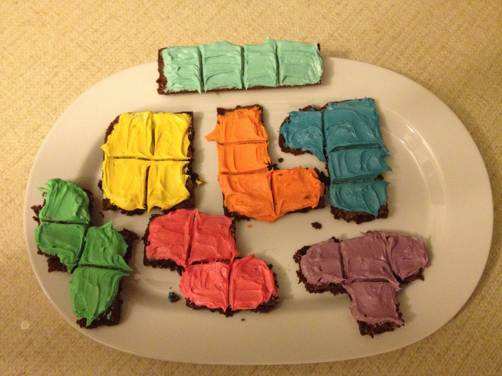 Once I had the pieces laid out on a platter, I referenced my cheat sheet and frosted each piece accordingly. I used the edge of my spatula to make the lines separating the individual “blocks” within each tetrimino. Overall, it was a fun challenge and the brownies turned out pretty good! The shapes were not perfect, but not bad considering my skill level – ha!