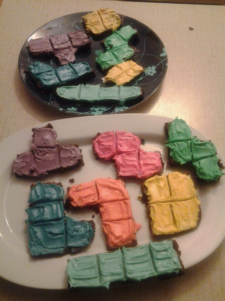 I was charged with an interesting challenge tonight. Tom somehow stumbled across this picture of brownies that were shaped like Tetris pieces (and appropriately colored/frosted), and asked if I would make him Tetris brownies. Um, sure. I mean, why not? I didn’t really have anything planned for tonight, so I decided to give it a go. I looked up the original post from the picture he found to see if it had any instructions or helpful hints, and it did have a basic “how-to”. You can read that post here.