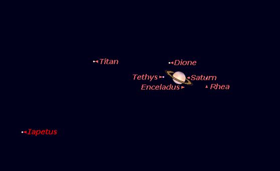 I’m not sure, but I may have happened upon something else tonight. Off to one side of Saturn was a tiny, faint speck. I wondered if it could be a moon. I’ve seen Jupiter’s Galilean moons through my telescope before, but never any other planet’s moons (besides our own, of course). I checked my Starry Night program to see where Saturn’s moons were currently situated in relation to the planet from my perspective. Here’s what I came up with: