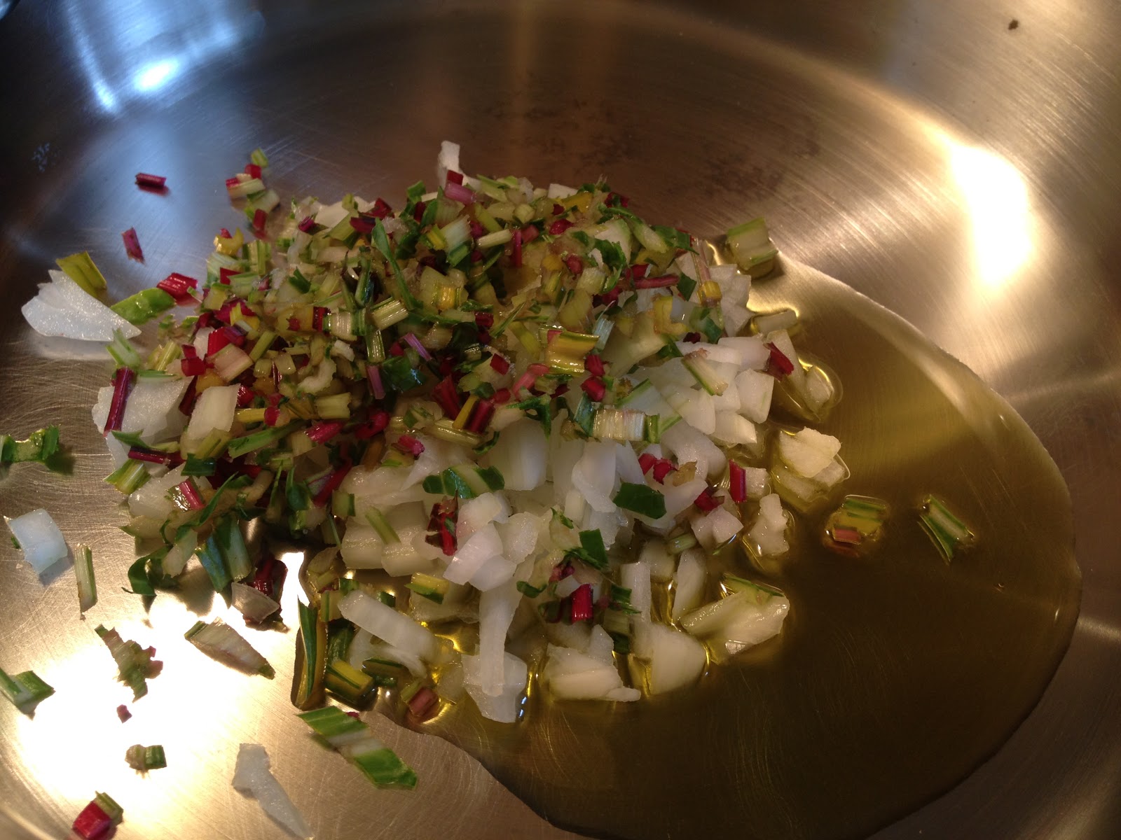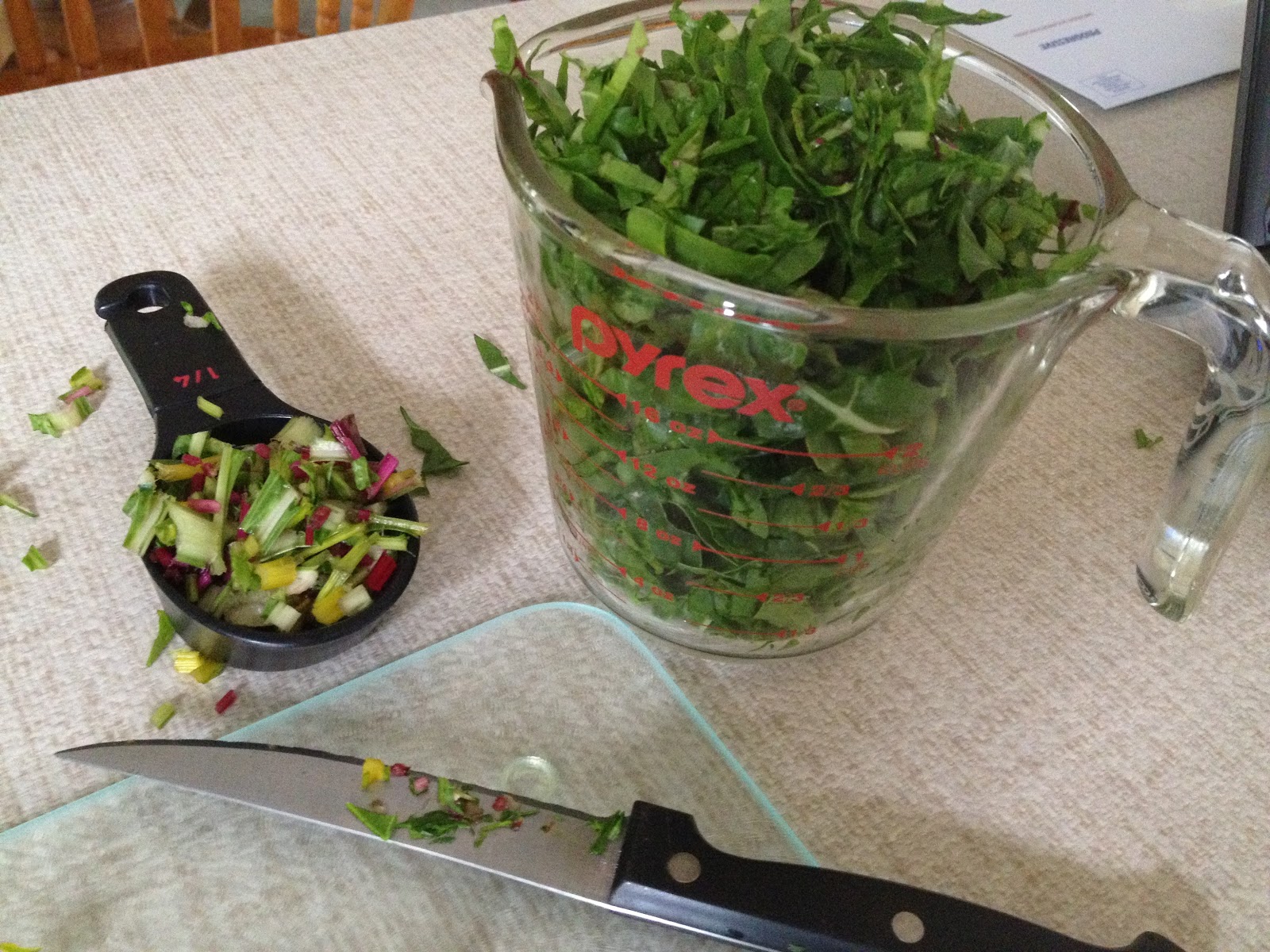 - 1 bunch chard leaves and stems separated — enough to fill three cups chopped (I just guessed on the amount I picked!)