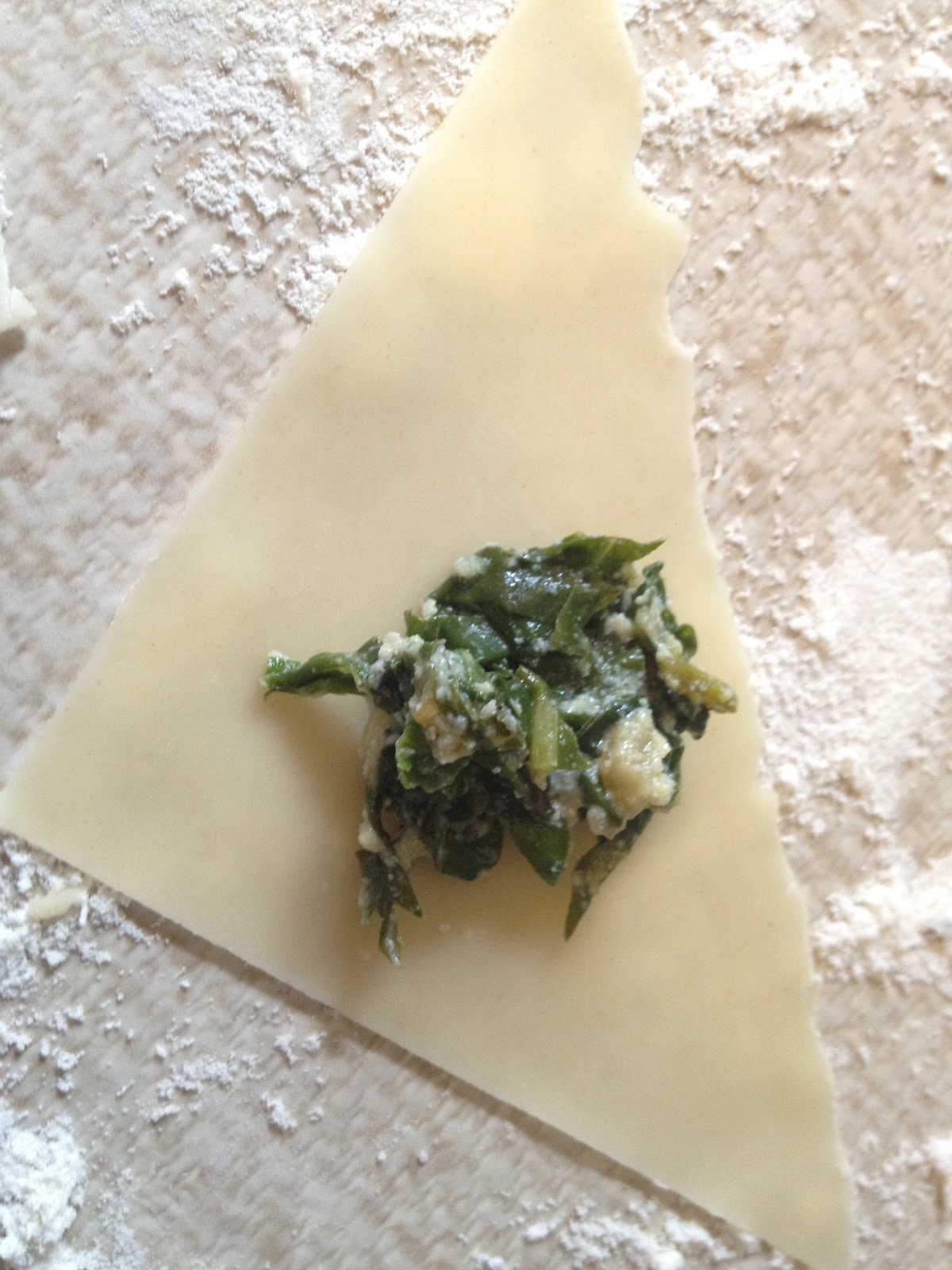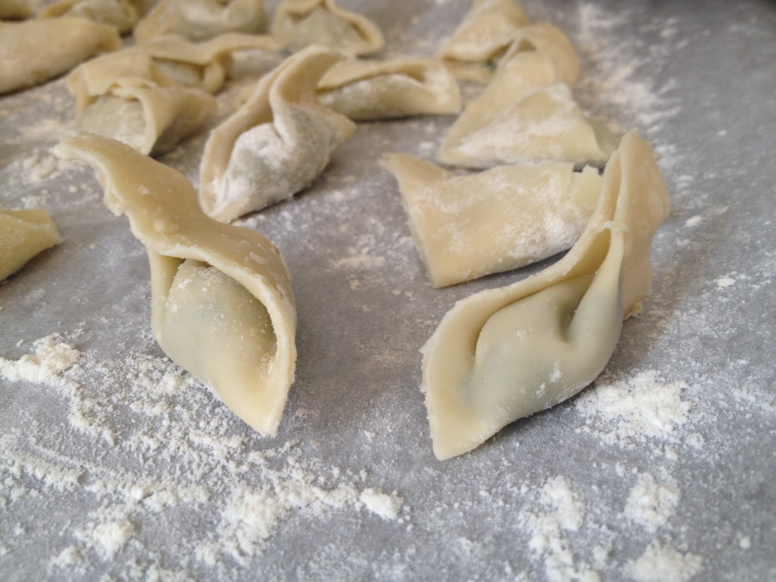 These were rather tedious to make. You have to cut the wonton wrappers in half and do lots of folding and sealing to make them into the little dumplings. And you can only fit about 1/2 of a teaspoon of filling in each one! It really took forever. I ended up using about half of the wonton wrappers for the dumplings and maybe 2/3 of the filling before I switched gears. I ended up adding I think 3/4 of a cup of ricotta cheese and about the same amount of shredded Italian cheese blend to the remaining filling mix.