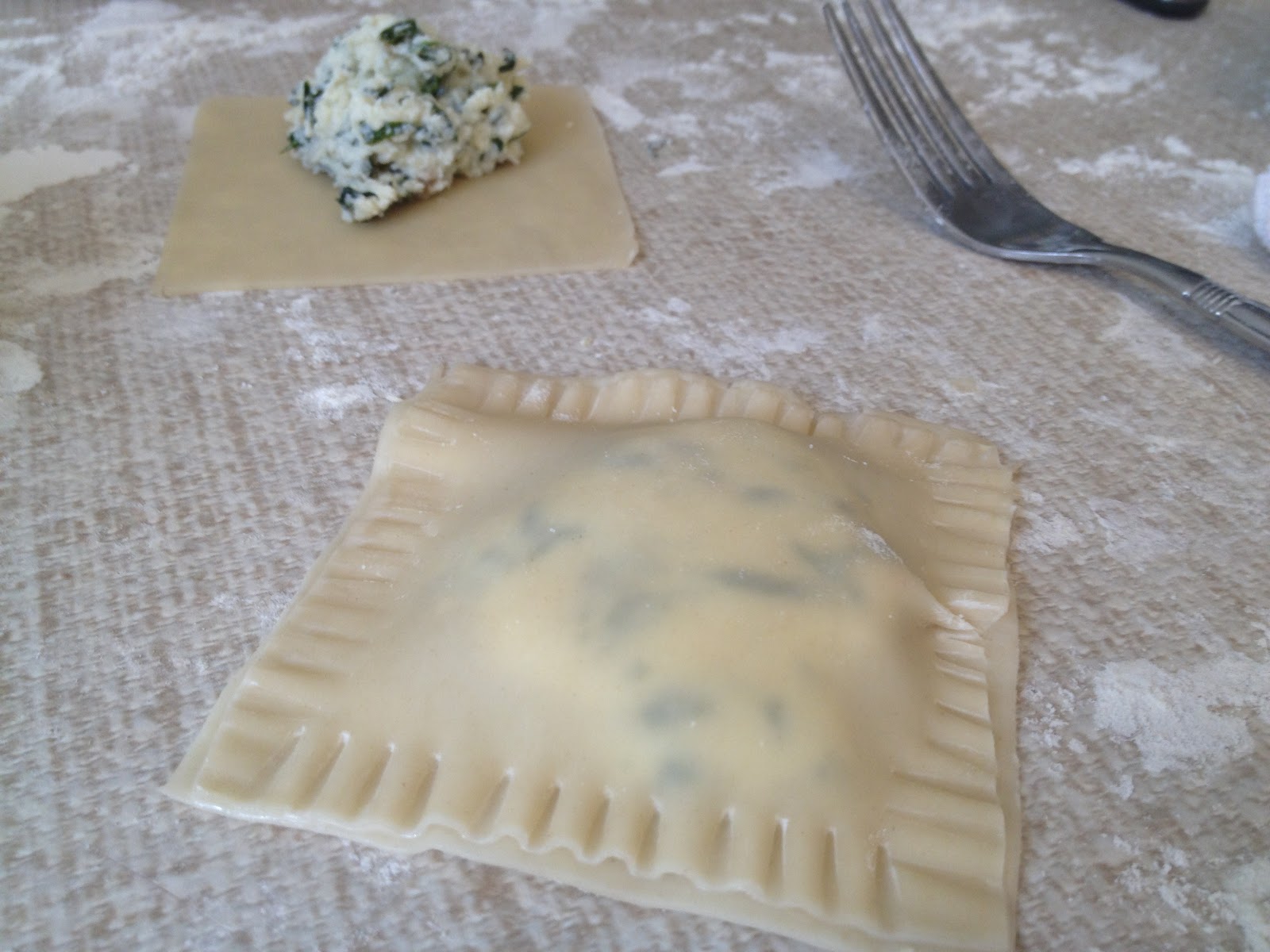 Let me tell you — after making those dumplings with such painstakingly slow progress, the ravioli was a joy to make! I used two whole wonton wrappers for each — just plopped a big tablespoon of filling in the middle of one wrapper, then placed another one on top. I then wet the edges of the bottom one with a little water and used a fork to press the edges together and seal it. It went so much faster to make these, and it’s a good thing, too, because I was about ready to be out of the kitchen by that point (that was after a couple hours of standing in the kitchen after doing an event for work on my feet all day).
