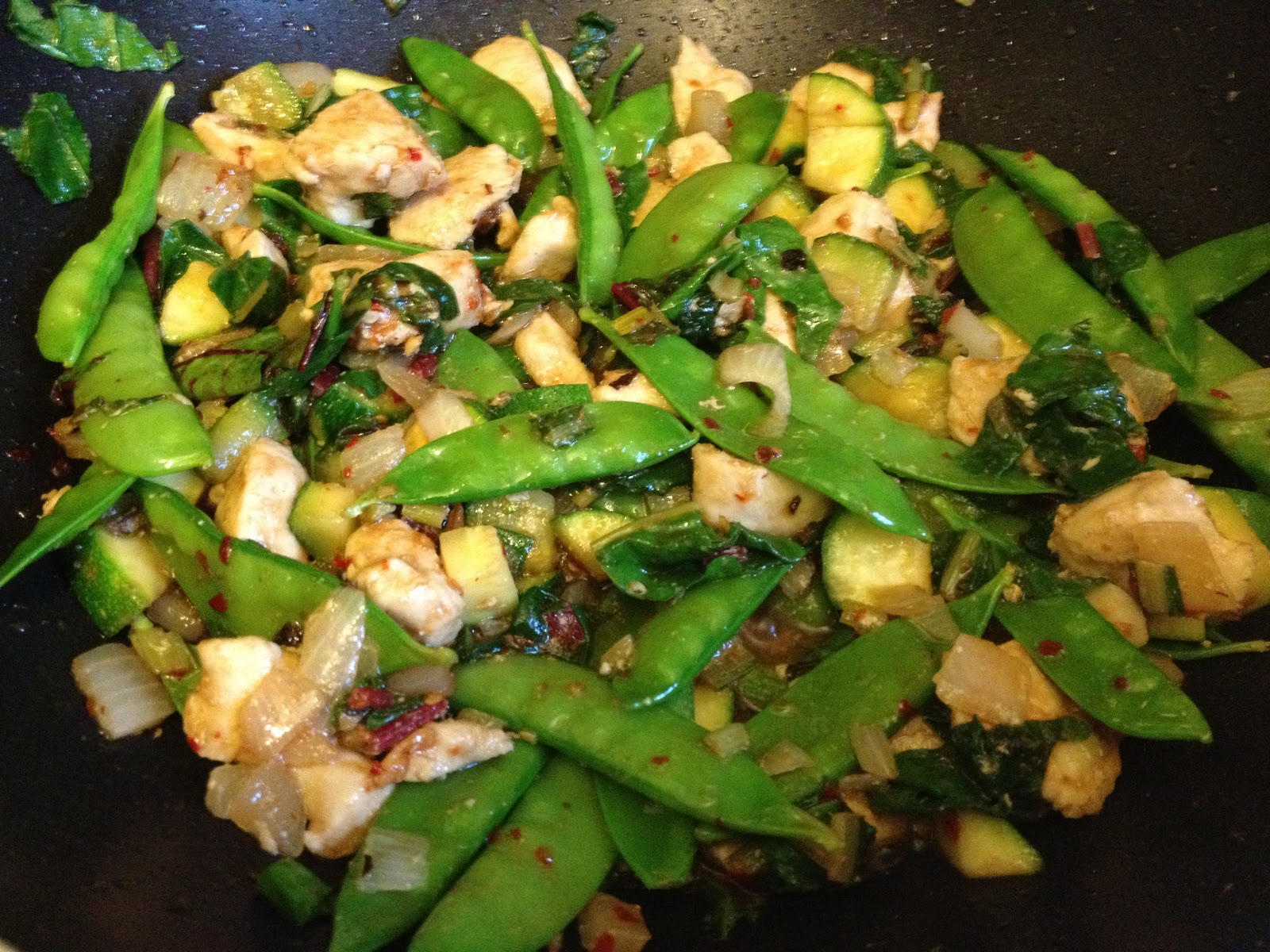 My next big adventure in cooking with Swiss chard was just a couple of days later. I should pause and say that I did also use some in a sort of pasta primavera–cooked pasta tossed with a mix of vegetables in an olive oil sauce. But my big leap of “I don’t know what to do with Swiss chard so I might as well try something completely new” came with this recipe for Asian Stir-Fried Swiss Chard from Kalyn’s Kitchen. I’ve attempted Asian cuisine a few times with limited success. A few things have turned out okay; a few things have not been great. But this sounded interesting. And good. It called for a few different types of sauces that I didn’t have on hand, but Chili-Garlic sauce sure sounded good(!) so I went grocery shopping. Now, the recipe is just for Swiss Chard. However, I didn’t think that Tom take too kindly to the idea of me placing a giant bowl of stir fried greens in front of him, so I altered the recipe into a chicken stir-fry with swiss chard as one of the main vegetables. I also used some peas from the garden and some onion. The result? Delicious! The flavors of all of the ingredients that go into the sauce blend well and make a really tasty dish. Even if it were just Swiss chard, I’m sure it would be tasty. It wasn’t spicy, though — so next time I will probably use more of the chili-garlic sauce and/or add in some red pepper. Yum yum!
