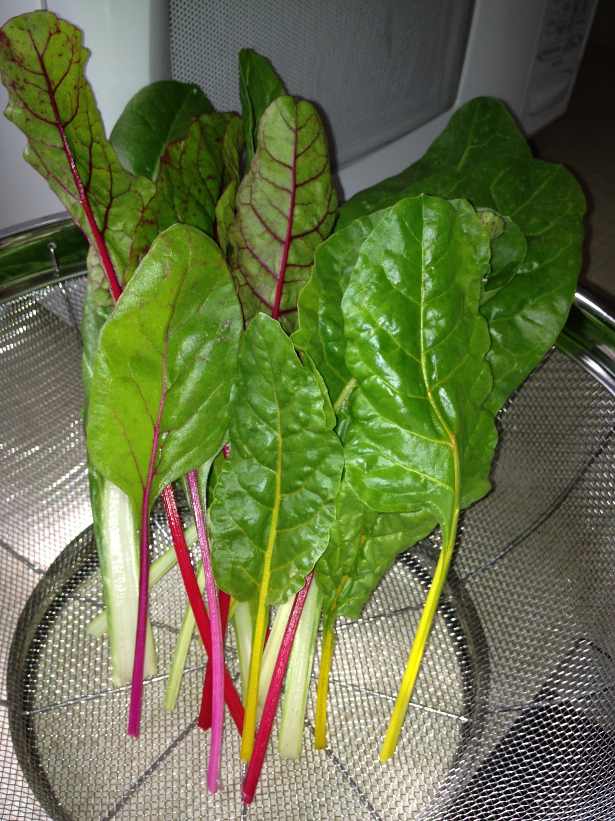 I decided to grow Swiss chard in my garden this year. I’m not exactly sure why, but I think this is what happened: I went to the farmer’s market sometime last summer and was lured in by the bright stalks of the multi-colored Swiss chard one of the vendors was selling. It was so pretty that I just had to buy a bunch of it. I think I ended up roasting that with some root vegetables, but I don’t remember for sure how I prepared it. I may have had chard one other time. But the bright colors stuck with me, and I know it’s supposed to be a very healthy green, so I decided to grow some. In the past few weeks it’s grown to the point where I could begin to pick it. Only, I didn’t know what to do with it once I did pick it. The whole roasted root vegetable thing is more of an autumn dish, and definitely not ideal for this heat wave we’ve been having. So, I looked up a couple of recipes, and here’s what I ended up doing with my first couple pickings of chard.