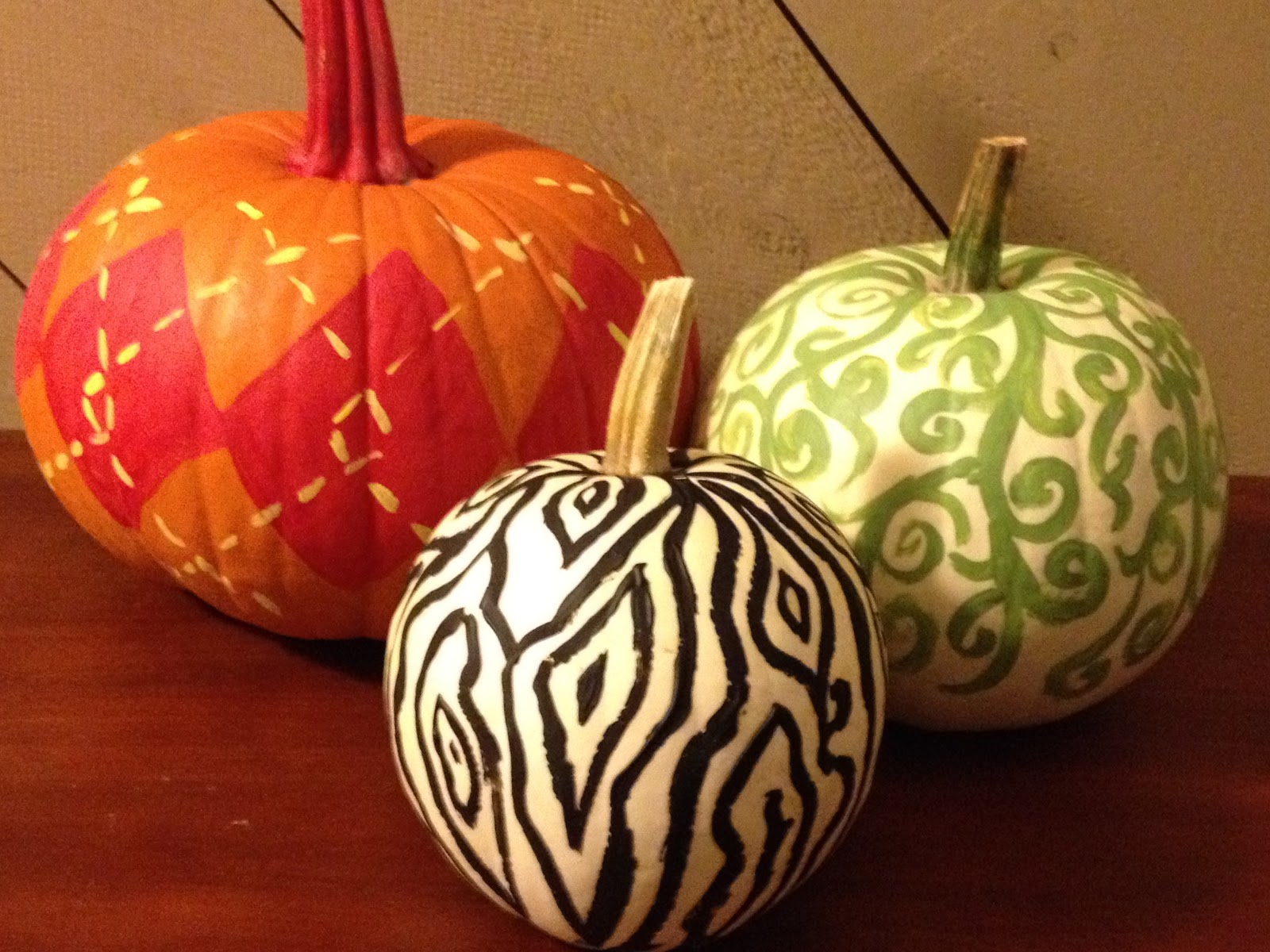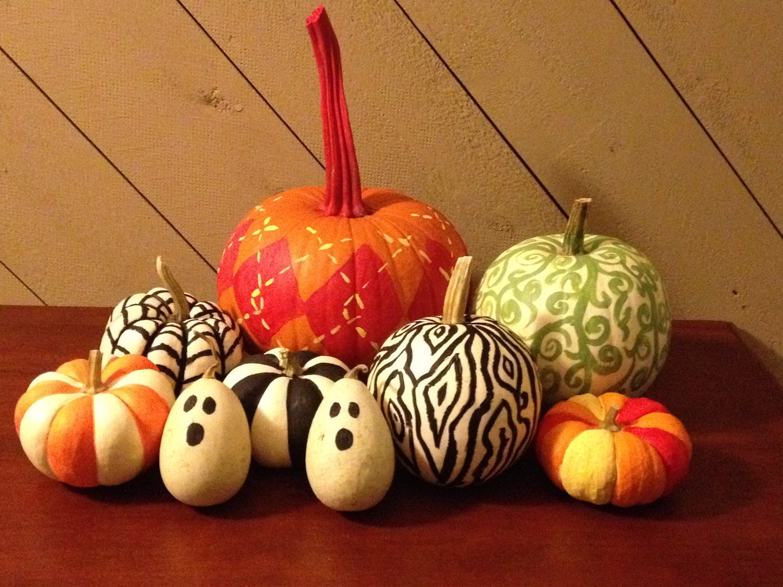 This year, I ended up with a lot of the same types as last year, because I really liked what I got. I also decided to do some pumpkin painting with a friend again this year – it’s fun, the pumpkins always turn out cute and they last a lot longer than if you carve them. Mind you, I do have a couple of larger pumpkins set aside as my carving pumpkins, but that will have to take place closer to Halloween. Here’s what I’ve ended up with so far: