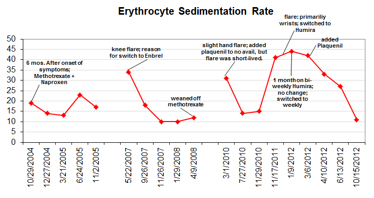 The story of the Sed Rate Saga continues. I wish I could say this was the ending, because it would be a happy one. I went to my rheumatologist’s office last week Monday and he gave me a lab order to get some more blood work done. The last time we had checked my Sed Rate (or, ESR) — a measure of inflammation in the body — it had come back as a 27. This was a big improvement from winter, but it was still slightly elevated. My doctor had stated at one point that he considers anything over 25 to be high. But, according to the formula I found on Wikipedia, my “normal” works out to be <=18.5. And, according to my own history, I should be somewhere in the teens, if not lower, when I'm feeling my best.