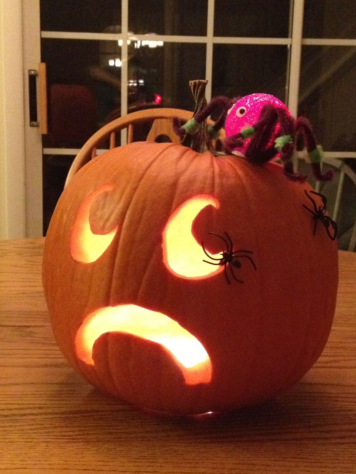 The second one I saw on Pinterest and one of my friends carved it for me!  She did a good job.  He looks so worried.  I have more spiders now…but haven’t gotten an updated photo.