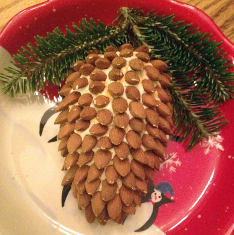 I made something else tonight that I have not tried yet. I actually stole the idea from Pinterest — it’s a pine cone shaped cheese ball! I used my basic cheese ball recipe, then just stuck in whole almonds on the outside to resemble a pine cone. I cut a little branch off our Christmas tree for full effect!