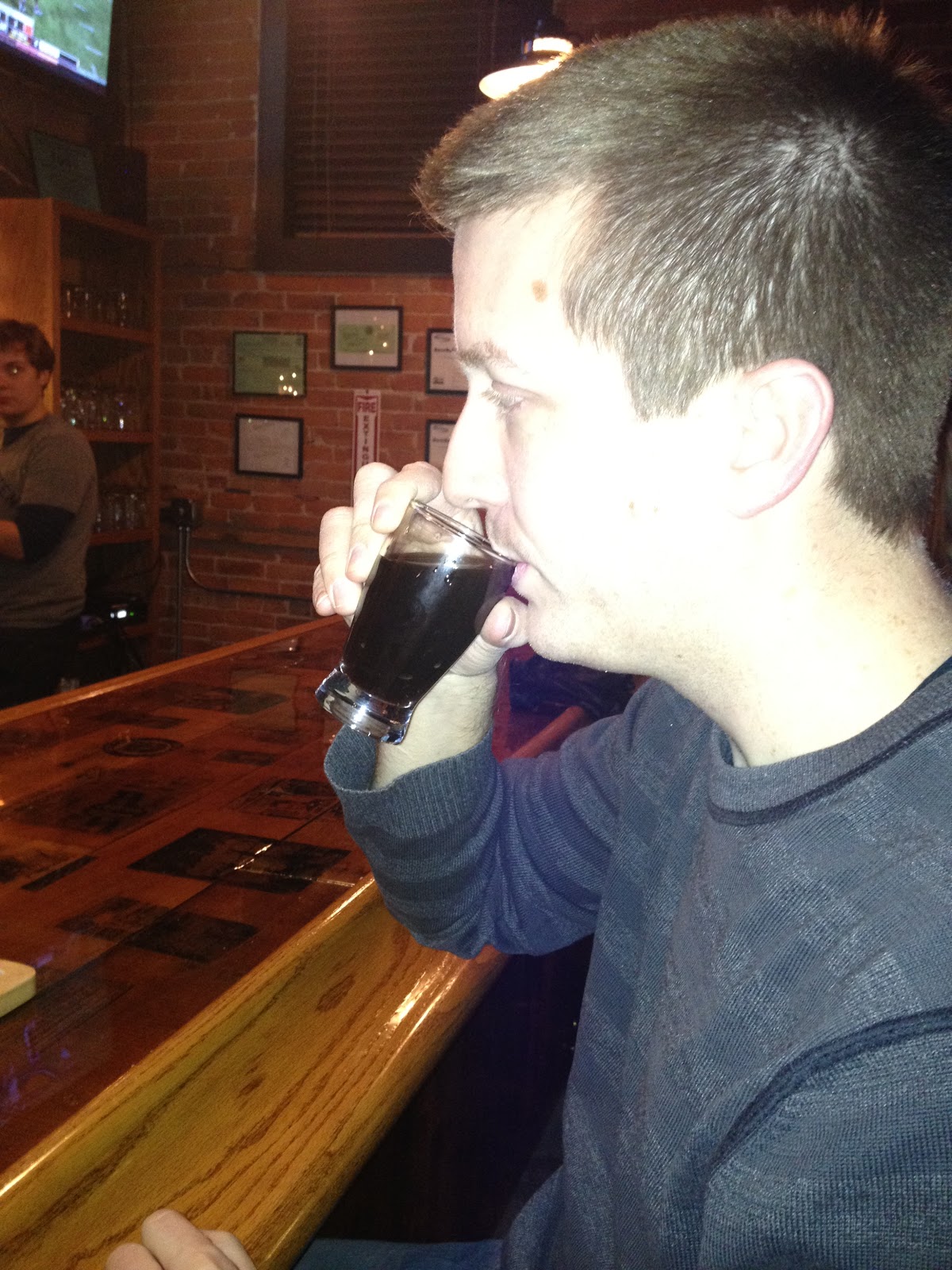 Today, we made our first stop in our West Michigan Brew Tour. It was already getting late on a Friday evening, so we decided to go someplace close to home. The Mitten Brewing Co. is a small place off of Leonard St. in Grand Rapids, with a baseball (mitt) theme. It was pretty crowded, but I suppose that should be expected on a Friday night. There were no seats when we first arrived, but I stalked some people as they left the bar and we swooped right in. Tom ordered a sampler flight of the four beers they had available today: