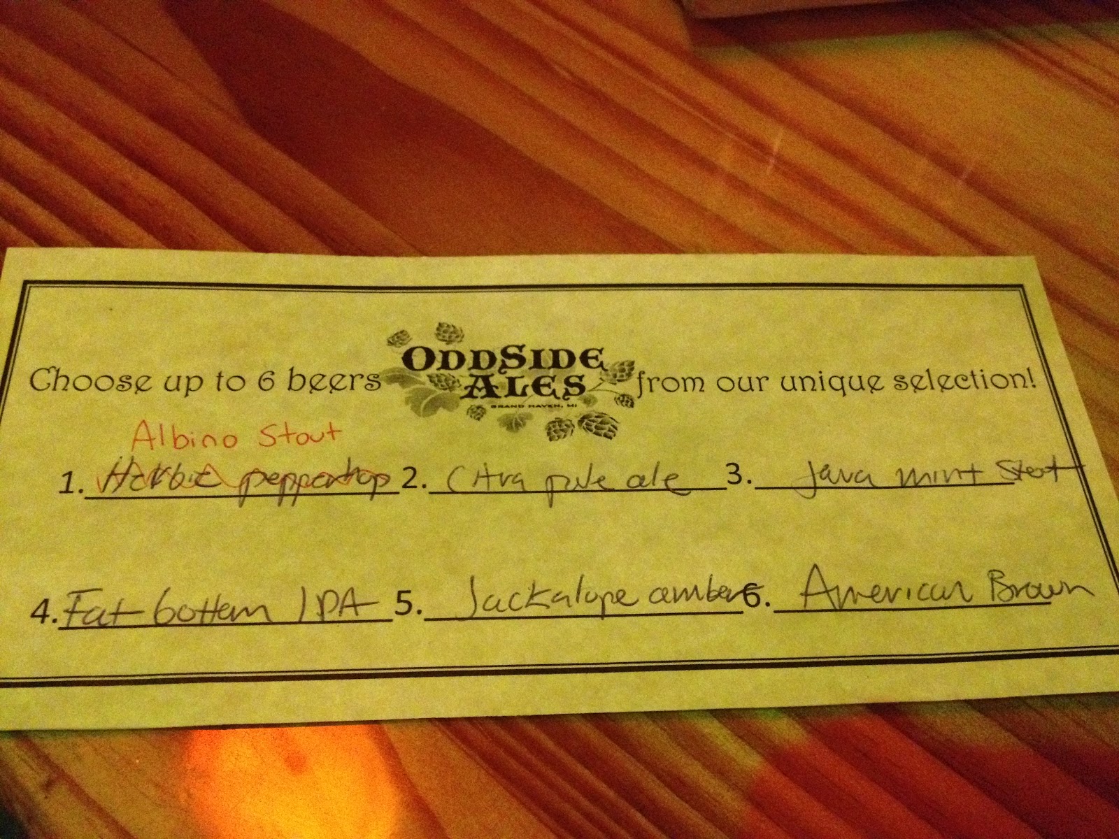 1. Albino Stout (he tried to get the Herbie Peppertop, but they were out) — hoppy, light stout