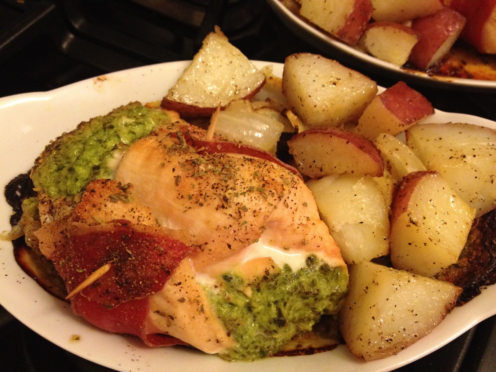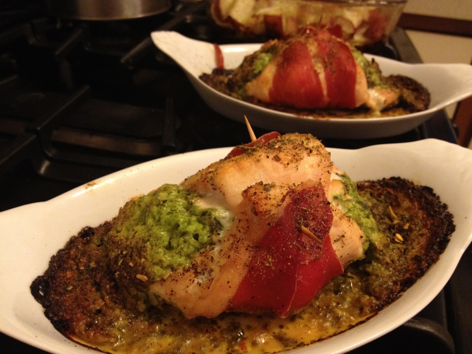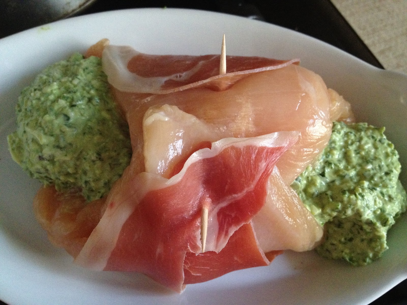 Pound out chicken breasts to flatten (I don’t have a good meat tenderizer or mallet, so mine weren’t all that thin, and it still worked). Put spinach and olive oil in a food processor and pulse until spinach is finely chopped. Add cheeses, sour cream and garlic and process until well combined. Spoon spinach mixture onto the middle of each chicken breast, then roll up both sides and secure with a toothpick in the middle. Wrap a piece of prosciutto around each chicken breast and secure with additional toothpicks, if necessary. Bake chicken at 350-375 degrees for about an hour.