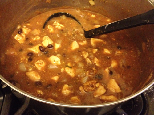 It is now mid-April — well into spring. Yet, all week we have dealt with cold 30-40 degree weather and rain. It’s been dreary, to say the least, and I’ve been more than a bit cranky as I wonder aloud why spring has not yet arrived. I was trying to decide what to make for dinner on Thursday night, and by the time I got home from work I had determined that it had to be soup. A nice warm bowl of delicious, hearty soup would surely warm my spirit on a cold April day. I had some chicken in the refrigerator that I had to use up or freeze, so I decided I’d make something with that. I had this vague idea of making “Chicken Tortilla” soup, but I didn’t really know what that entailed — and since this was a last-minute meal, I had not gone shopping for any special ingredients. I decided to peruse AllRecipes.com for some general direction, then raid my pantry to see what I could throw together. This was the result.