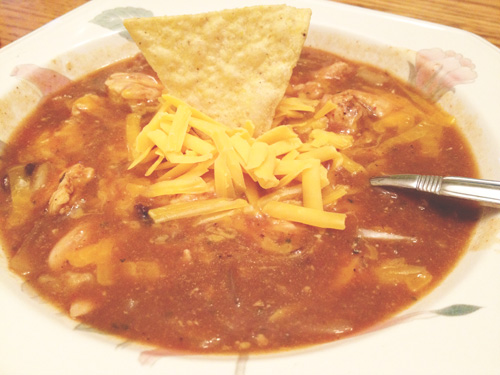 I thought it turned out great, especially for a “see what’s in the pantry and try to make something of it” sort of meal. The cheese and tortilla chips are a must, in my opinion 🙂 I think I’ll be making this one again — it was very simple and quick to make! To make it even easier, just get a rotisserie chicken, shred that, and add some extra seasoning when you make the soup.