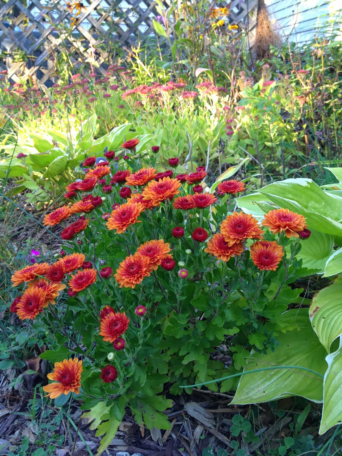 My perennial garden is looking better this fall, too. The mums I planted a couple of years ago are growing bigger and they are already blooming, along with the sedum. I had lots of clean up to do in the perennial garden, which I need to remember to do more frequently. Just getting rid of some of the dead stalks as they go really makes it look prettier! I decided I should plant some of my marigolds in here next year, as they also remain blooming in the fall.