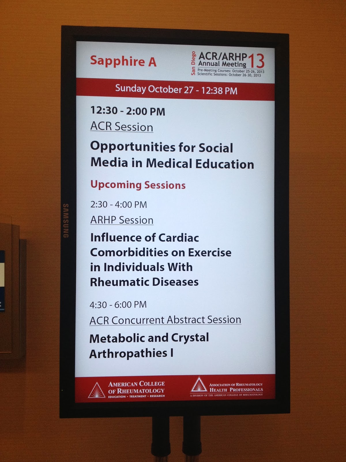 I did not have a lot of time to attend sessions today, but I did make it to most of a session on Opportunities for Social Media in Medical Education. As would be expected, a lot of rheumatologists that I follow on Twitter showed up, as well — I saw tweets coming through about the session from @carvicab and had to look around the room to try to find him! It was a very basic overview, meant more for those who are new to social media and who are interested in getting started using social media for medical education, patient education & engaging with others — but still a fun one to attend. After that, I had to rush off to a meeting; and then had a little bit of time left to spend at the Exhibit Booth; had a brief opportunity to see some of the posters in the Poster Hall before that closed (more on that later, as well — lots of posters today about Rheumatoid Arthritis and Cardiovascular Disease); and we got to see a rheumatologist friend present an abstract.
