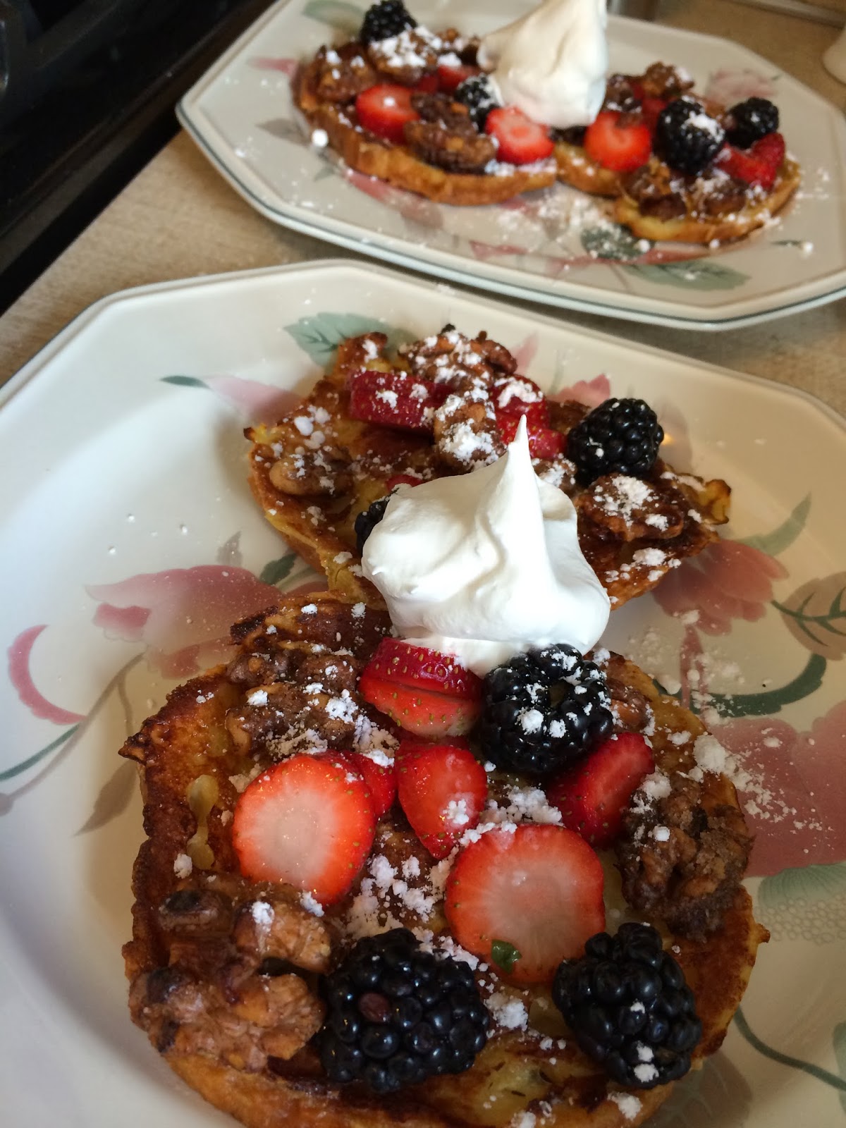 I wanted to make a special Christmas breakfast this year. I was perusing Pinterest and saw a recipe for Cranberry French Toast Casserole (which sounded pretty good), when an even better idea hit me. There’s a restaurant in downtown Northville (Rebecca’s) that Tom and I love and used to frequent. Every time we went for breakfast Tom would get the same thing: Croissant French Toast. Now, I’m not a huge French Toast person normally, but this dish is AMAZING. It comes complete with blueberries, strawberries, candied walnuts, and whipped cream. It’s really more like a dessert. As I was thinking about it, I realized it wouldn’t really be that hard to make. I found a recipe for Cinnamon Candied Walnuts on Pinterest, and also found a Croissant French Toast recipe for inspiration.