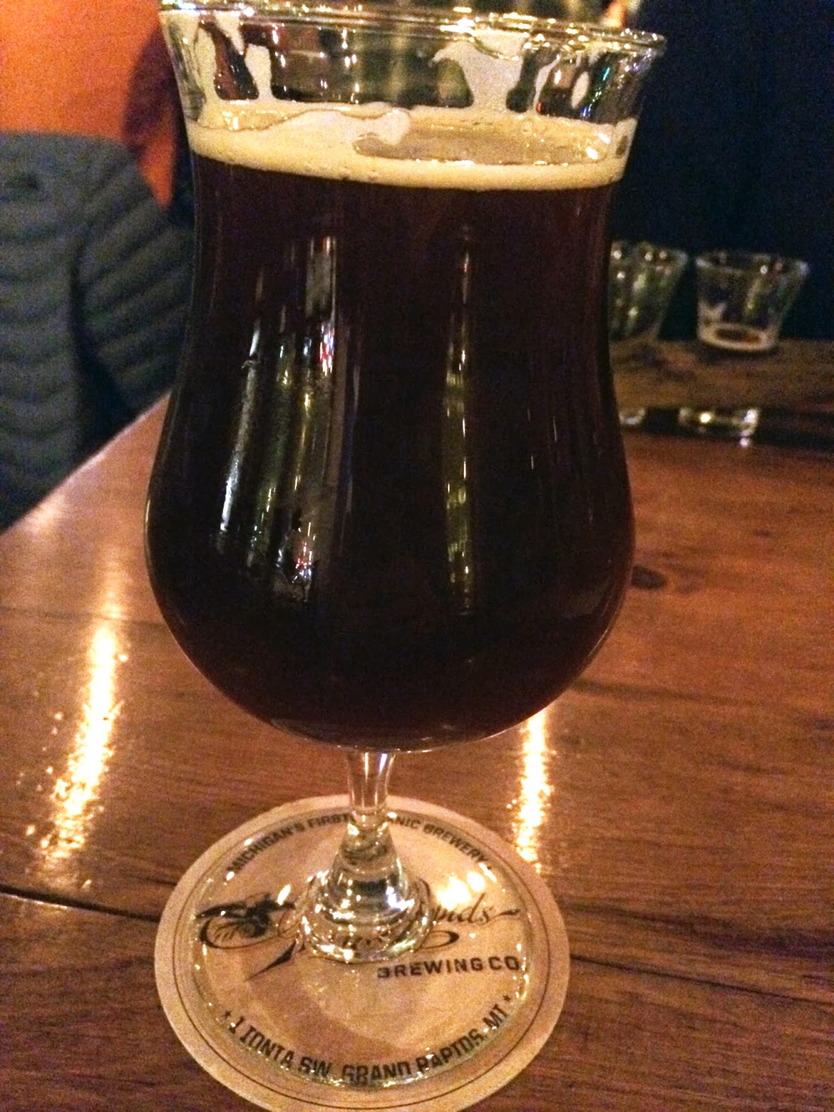 After an unexcusably long hiatus, it’s time to get back to the Brew Blog! We took some time off of our brewery tour as the weather got nice last year, but we’ve knocked off several new places this winter that I have not gotten around to posting yet. First places first, we’ll start with the Grand Rapids Brewing Company. Several weeks ago we caught an improv comedy show in downtown GR with a couple of friends. Afterwards, since it was right around the corner (or far too many blocks in the blustery Arctic tundra that has been West Michigan this winter), we decided to hit up Grand Rapids Brewing Company. None of us had been there before (unless you count the one time I went when it was the previous owners in the old location…not the same thing at all). GRBC is the Michigan’s first Certified Organic Brewery, which alone makes it pretty unique. However, you will notice that the prices reflect the high-quality, organic ingredients.