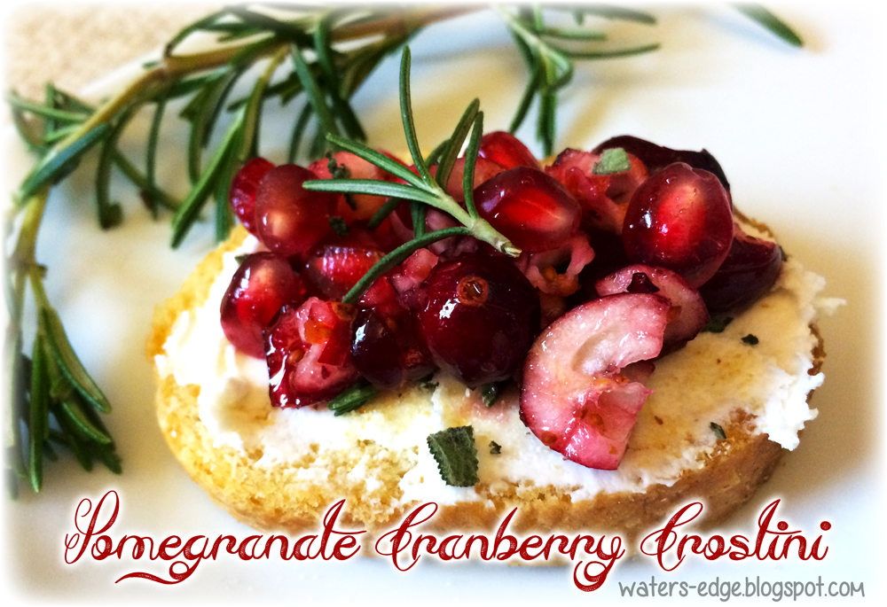 To serve, spread a crostini with a layer of goat cheese and top with Pomegranate Cranberry “bruschetta”.