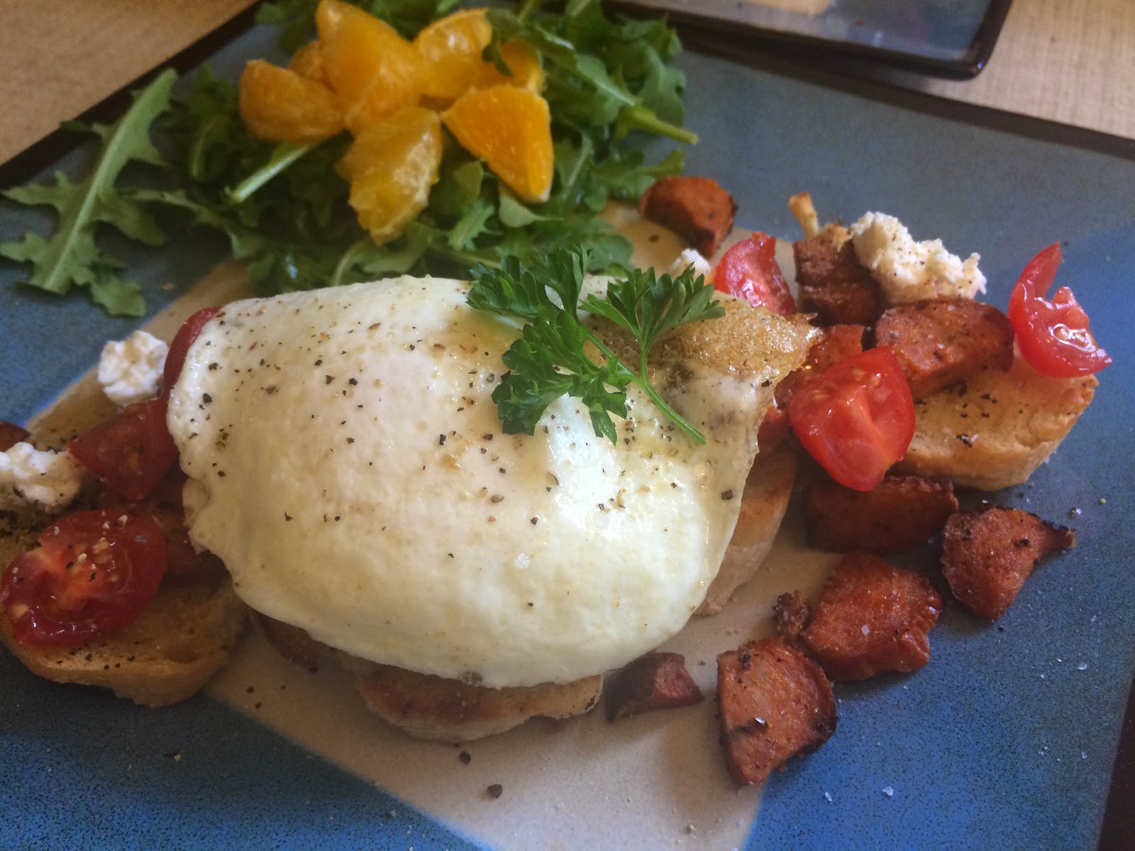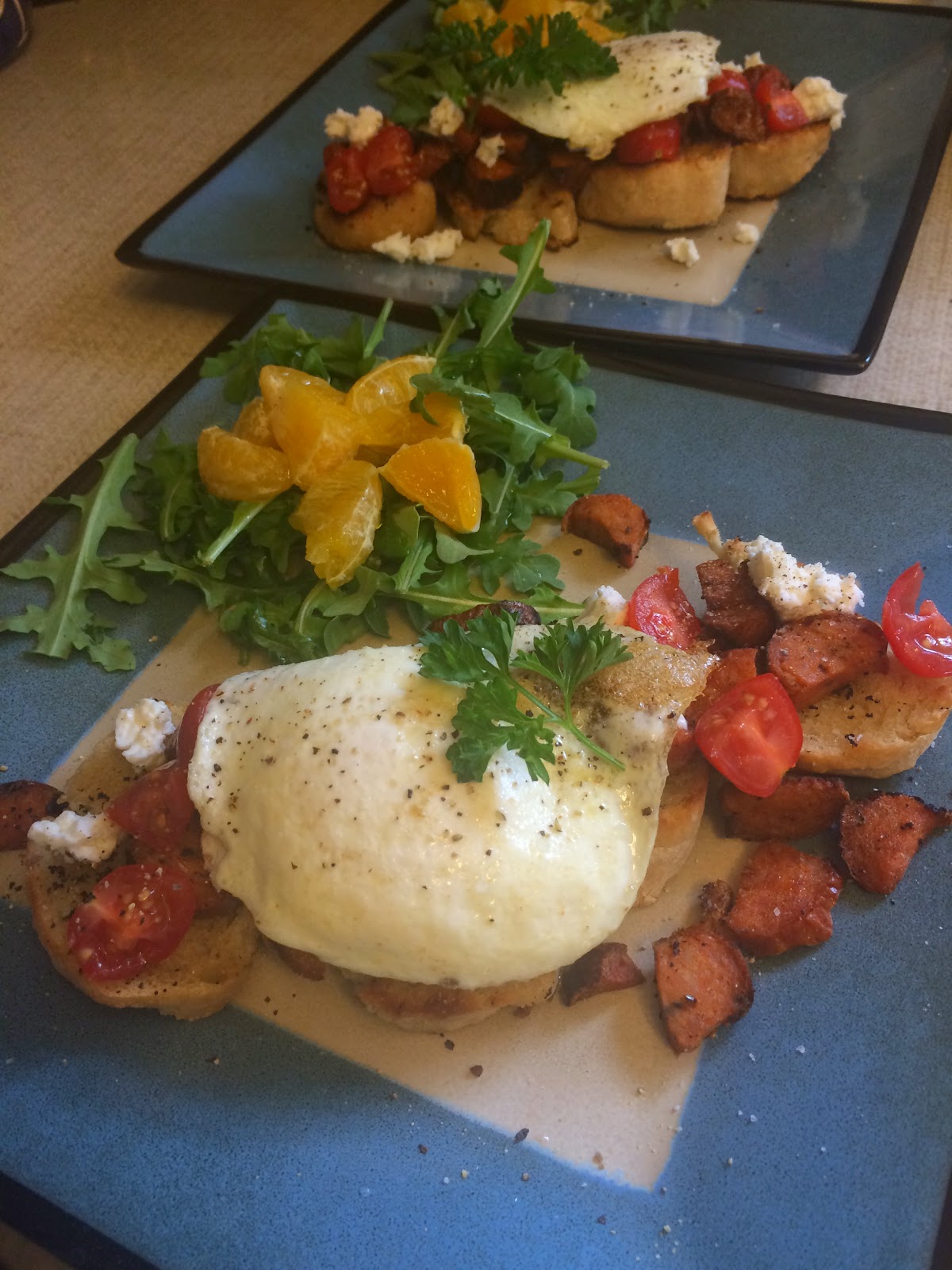 Twas the day before Easter and I just had a hunch, that combining these ingredients would make a great brunch! Some freshly made feta, and freshly baked bread, a fried egg and fresh salad did rouse us from bed! (Okay, enough of the rhyming.) Seriously, though. I’ve been on a homemade bread kick since a friend introduced me to this book (go buy it now!). And I FINALLY used my cheese making kit a friend got me for my birthday to make some feta! I needed to try out the cheese and brunch sounded like a good idea. I had seen some recipes for egg “boats” using french bread — but I only took a half loaf out of the freezer and it didn’t seem big enough for that. So, I made up something new. I don’t know what to call it, so for now it’s the FFF brunch (French bread, Fried egg and Feta). Whatever you want to call it, it’s delicious. Also – brunch side salad = good idea!