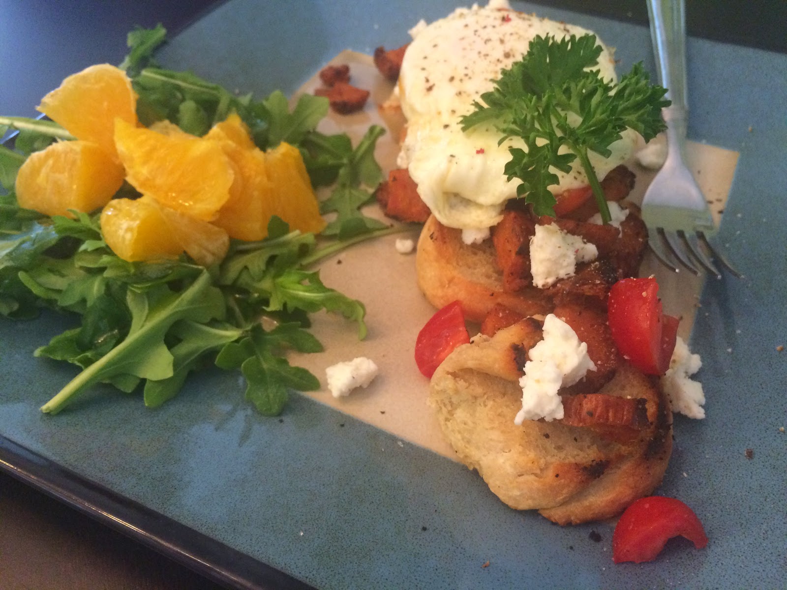 YUM! The fresh, creamy feta really made this dish. If you’ve not tried making cheese before, I recommend trying it! It only took me 4 months to break into my cheese making kit — it looked intimidating, but it was really quite simple. I’ll be going for round 2 soon. I used cow’s milk, but will maybe have to experiment with goat’s milk, too, if I can get my hands on some. Also, I don’t think I’ve ever served salad as a breakfast/brunch side, but this was really simple and really good. Not bad for a spur of the moment, day before Easter creation!