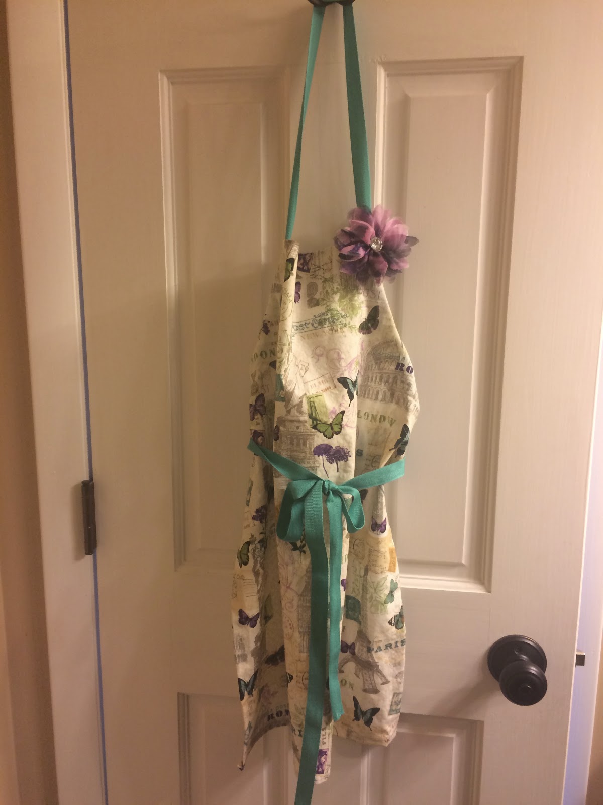 After I finished the first two aprons, I had one more thought: my niece’s birthday was coming up and she also loves to bake! At 11 years old (aahh….they grow so fast!! Sorry, had to say it.), she’s growing up and has decided she’s in love with Paris. I went back to JoAnn’s and lo and behold: cute, Paris / postcard fabric! I had to get it. I made hers a little more simplistic, hoping it will fit for a while. I also ended up buying ribbon to use for the neck and waistbands. To add some extra flair with something other than a ruffle, I added a bright purple flower pin that can be removed when the apron needs to be washed.  The benefit of this apron is that there’s just one long ribbon for the neck and waist tie, which pulls through casing on each side — so the entire thing is size adjustable. The fabric ribbon was perfect and simple. I’d do one like this again!