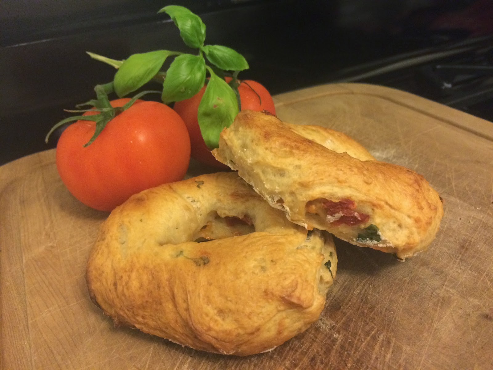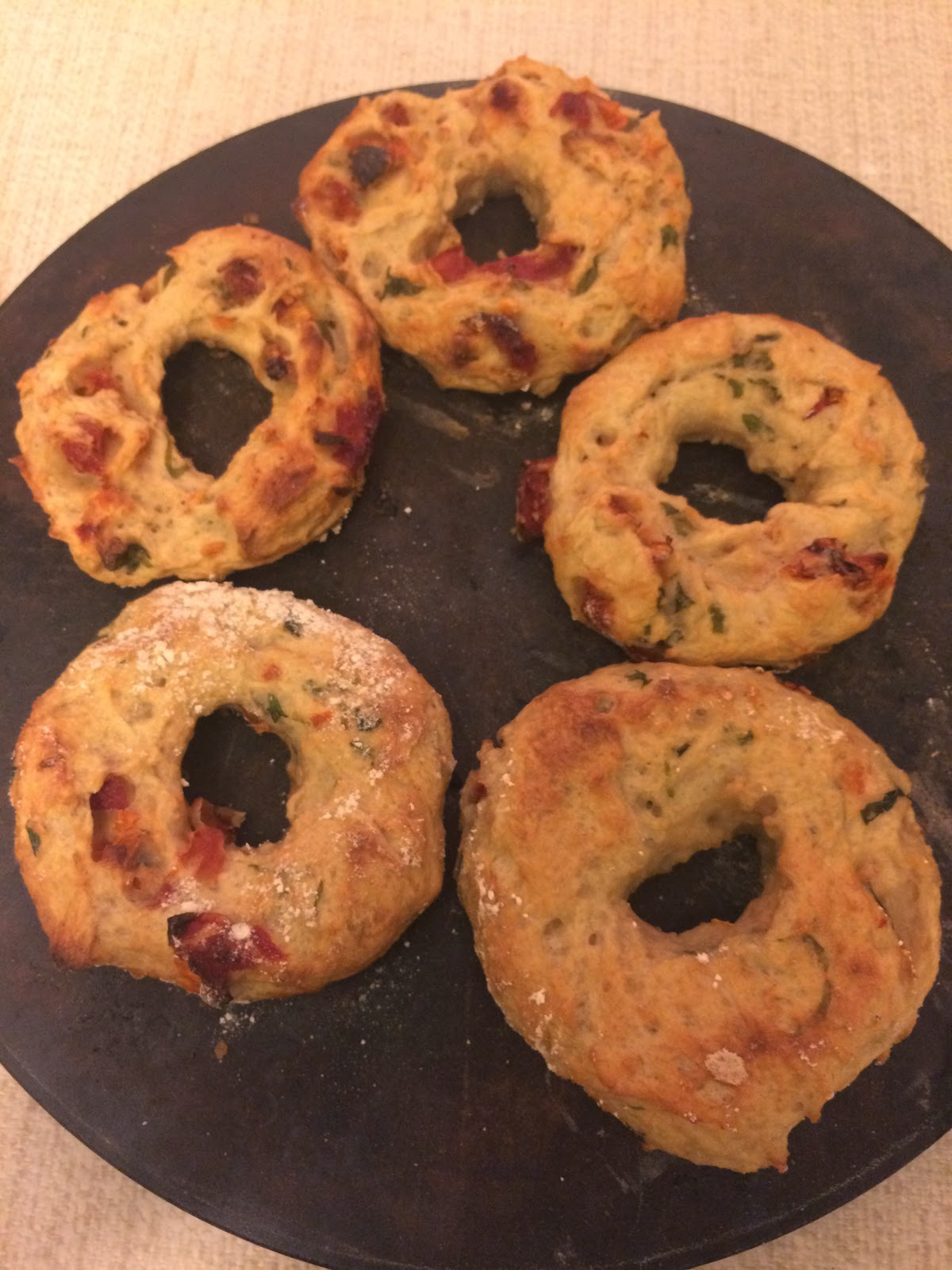 Unintended though it was, this past weekend was a weekend of making things — mostly food. On Friday, after a delicious surf ‘n turf meal (in which I almost burnt the house down when the grill caught fire, but miraculously managed to keep the steaks from getting charred or overcooked), I decided to try the bagel recipe from my bread book. I used the provided recipe, only I added sun-dried tomatoes and fresh basil, since that’s one of my all time favorite bagel flavors — and it’s hard to find! I made up the dough on Friday and refrigerated it overnight. Saturday, I attempted the bagels. They turned out…just…slightly…misshapen. I got two out of nine that were fairly good looking and decidedly photo worthy.
