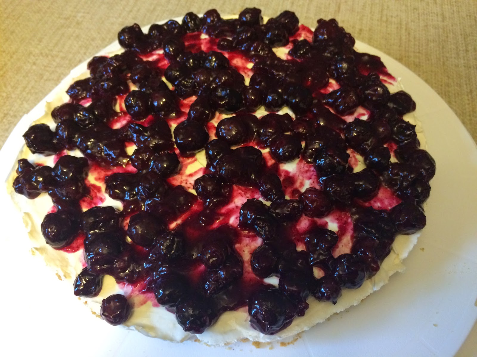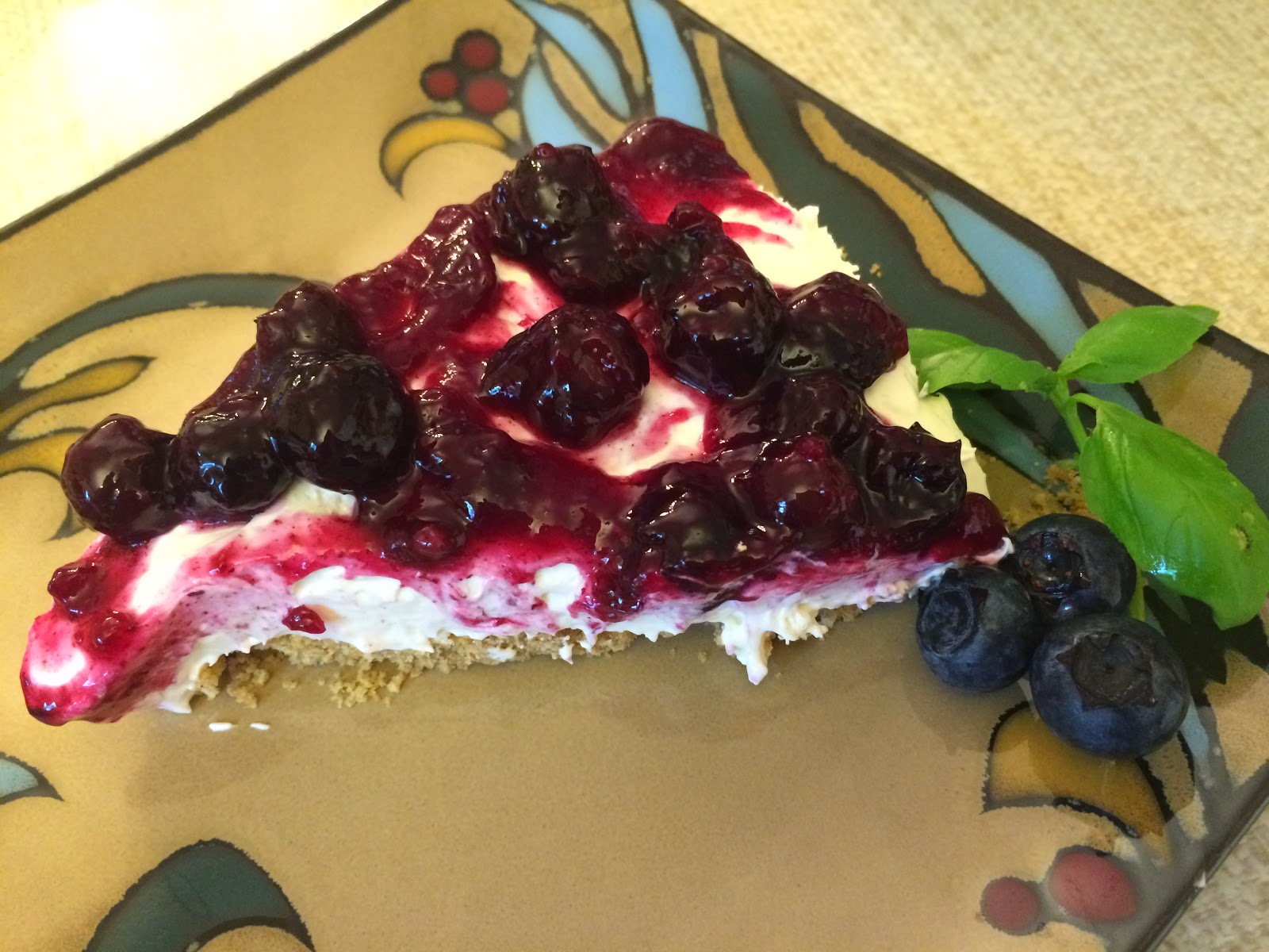 Now, I had lots of leftover Blueberry Lemon Sauce, so it was onward with my dessert plans. I had this idea that a vanilla cheesecake type dessert would be scrumptious with the sauce on top. Only, I didn’t have much time and I’m not very good at cheesecakes. After a quick search for an “easy” or “no bake” recipe, I stumbled across this one. The only problem is that it is a recipe from the UK where they call ingredients by different names and measure everything by weight. That’s not really a problem, though, because I know how to make a graham cracker crust and I can Google “demerara” sugar and use my (ahem, Tom’s) new kitchen scale to weigh ingredients. Except…I didn’t do all of the conversions before I left for the grocery store…and I came home with about half of the cream cheese that I needed. So, without time to go back to the store, this was one of those recipes born of necessity — which sometimes ends up working just fine! Cheesecake is normally too rich for me, so I wanted something lighter anyways. With less cream cheese on hand, I made a really thin layer of cheesecake filling atop a graham cracker crust and then added the Blueberry Lemon Sauce. The result was success! A delicious, light vanilla cheesecake that paired excellently with the sauce.