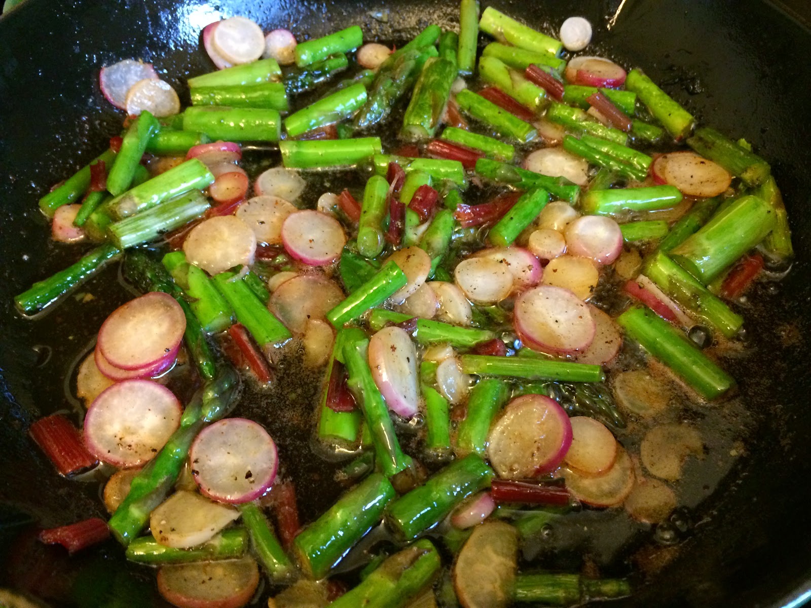 In other good news, the vermin that had been stealing my peas before they sprouted did not find them this year! I think I will actually have a real pea harvest again this year — hopefully beginning in a couple of weeks! This is also the second year of asparagus harvesting for me, and wow is it coming in!! We’ve eaten some with dinner a few times already, and I’ve about filled up a gallon size ziplock back with them. The radishes are coming in, too….which got me thinking…could I find a recipe that used both asparagus and radishes? I thought they might go nicely together in some sort of salad. I had plenty of greens. After a little bit of research, I decided to make up my own recipe using four spring garden treasures: asparagus, radishes, Swiss chard, and arugula/rocket.
