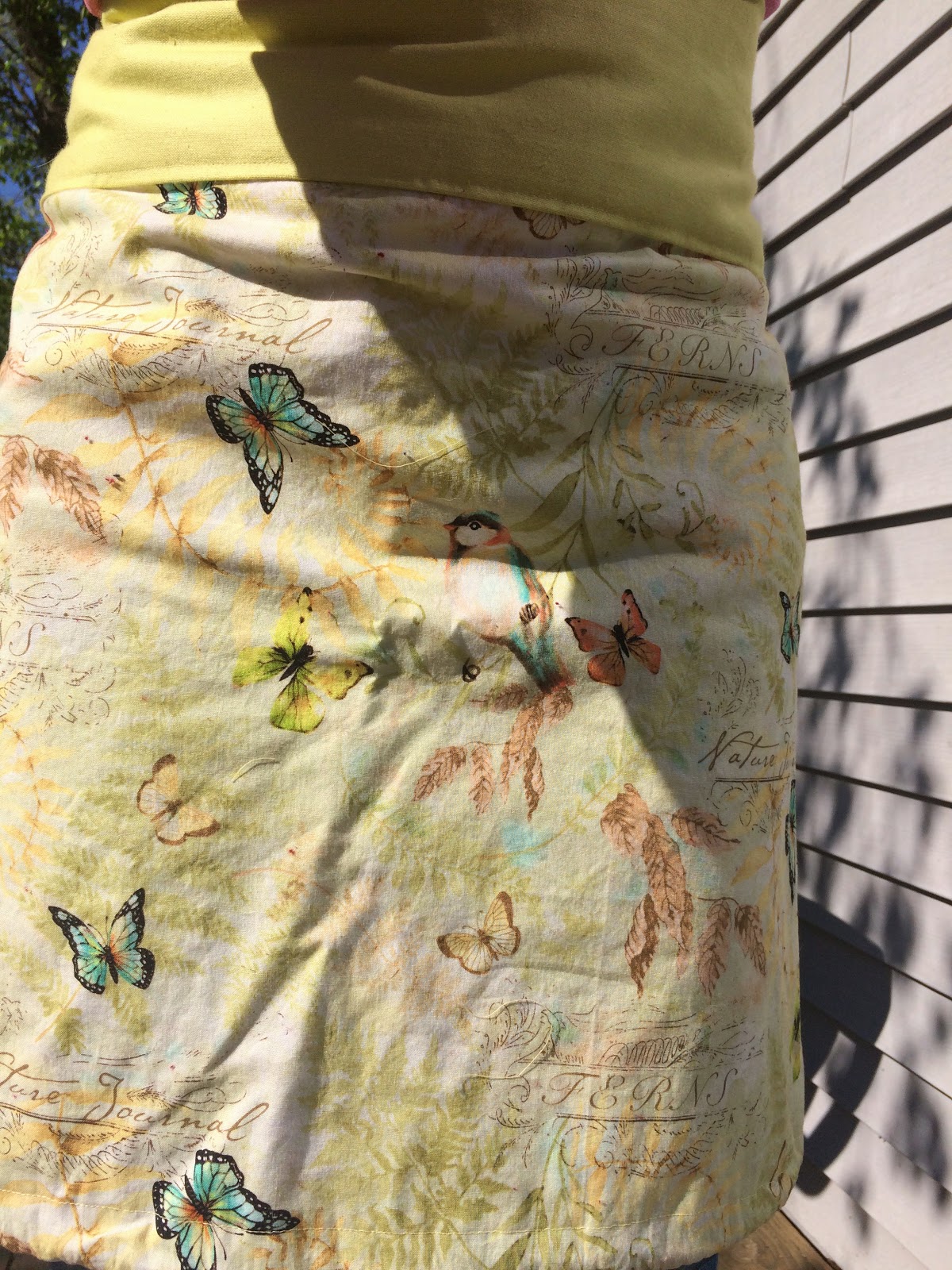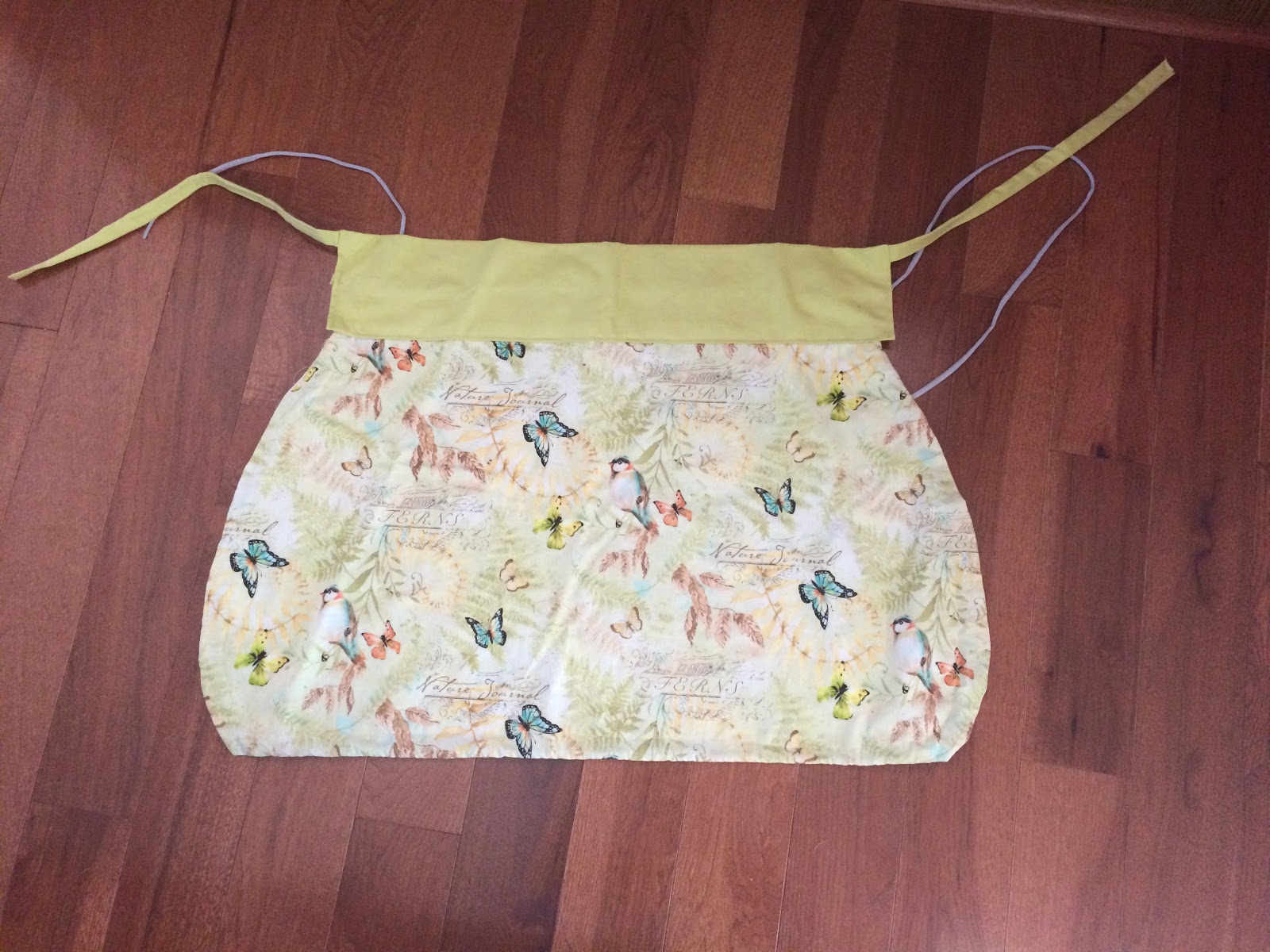 I had found the perfect fabric whilst shopping for my niece’s apron supplies. It was on clearance (bonus!), and had cute birds, butterflies, plants and scripty “nature journal” text. It was just begging to be made into a harvesting apron. I should have take photos of the process, but alas, I did not. True to my style, I did not use any sort of pattern, but mostly eyeballed and measured against myself to get the fit I wanted. I really wanted the apron to be double sided both for extra sturdiness and so that it would still look nice when gathered. However, that left me a little short on fabric to get the length I wanted. I ended up finding some scraps from an old home decor project that matched the green in the patterned fabric nicely, and I ended up using that as a waistband to add to the length. I decided to have the patterned fabric start at my hips. I measured it to be wide enough to almost circle around my back and come down to a coupe inches above my knees. I rounded out the corners on the bottom, as well.