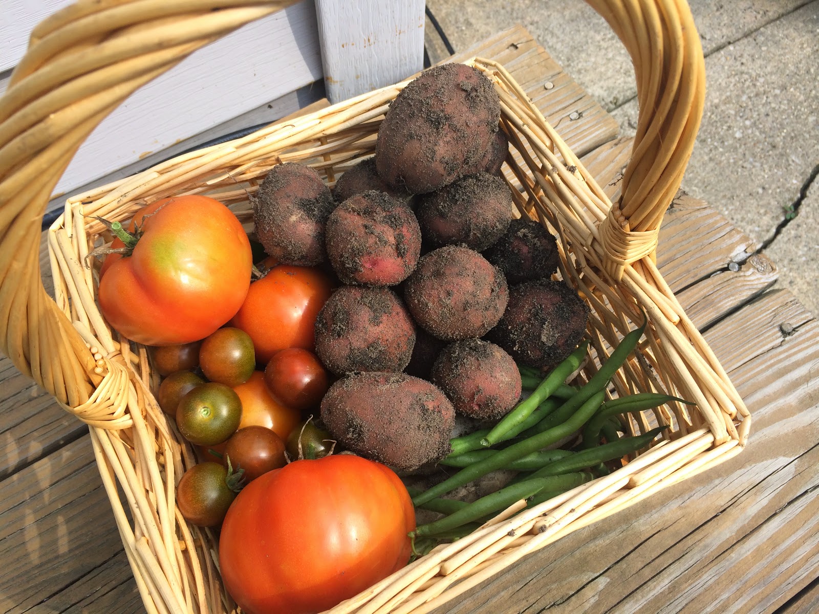 It’s a good day when my bounty extends beyond what I can easily carry in my hands, but when the tomatoes and green beans are coming in strong at the same time, it does happen. Or in the spring when the leafy greens all come on at once. I frequently gather up the bottom of my shirt to carry in a large harvest. Last year I got smart and started bringing a basket out with me.